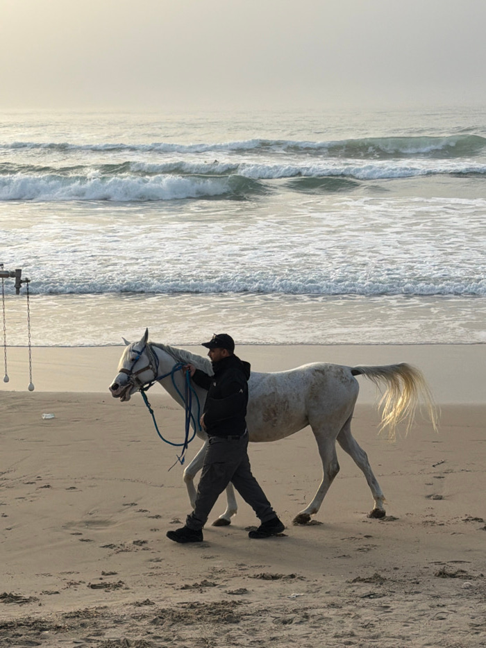 On a sandy beach, a man in a black jacket, gray pants, and a baseball cap holds the reins of a white horse. The horse appears agitated, its tail raised. Waves are visible to the left, crashing onto th…read more