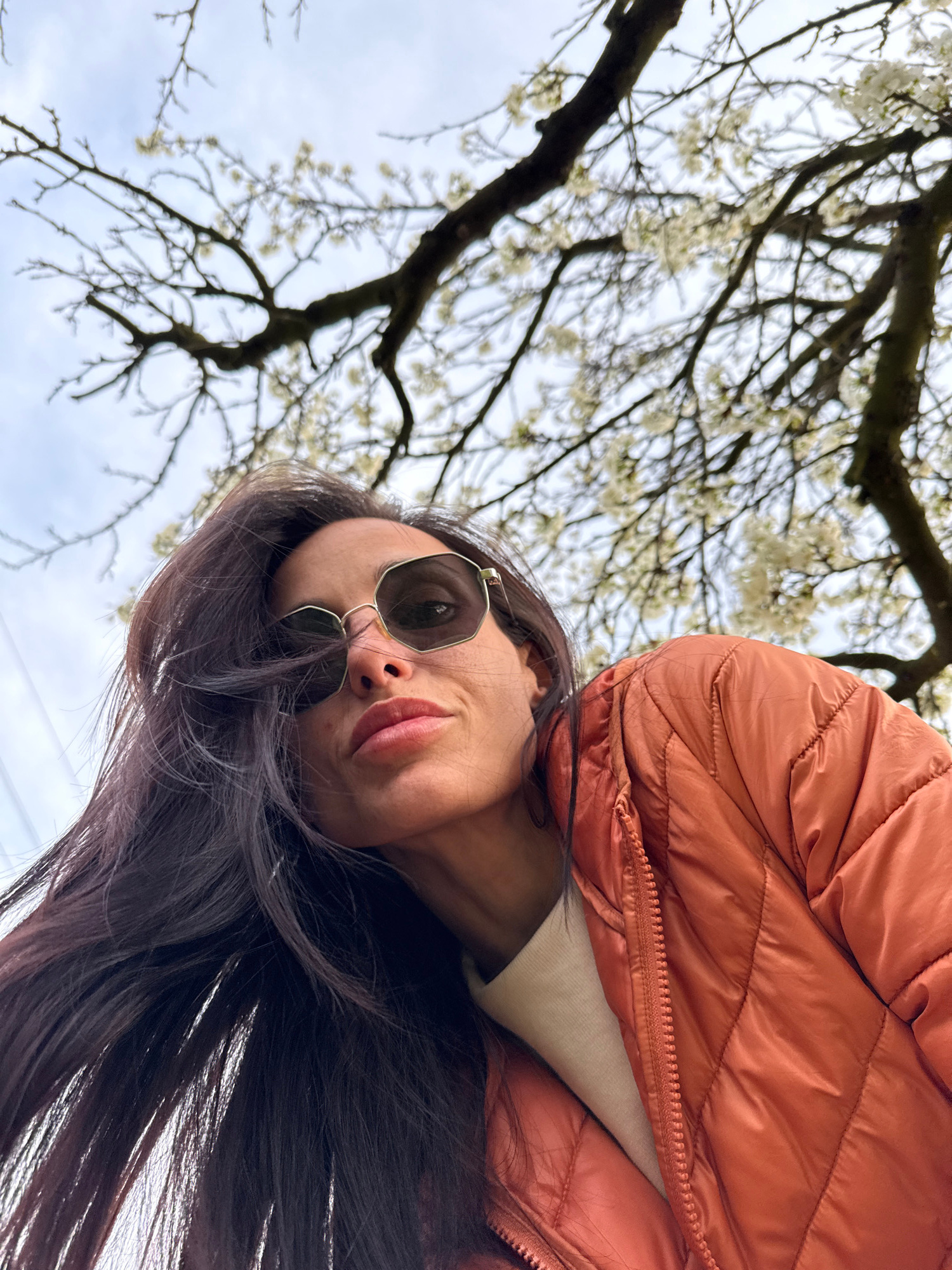 An upward-angled outdoor photograph shows a woman with dark hair and sunglasses, wearing an orange quilted jacket, under a flowering tree. The woman's face is tilted towards the camera. The tree branc…read more