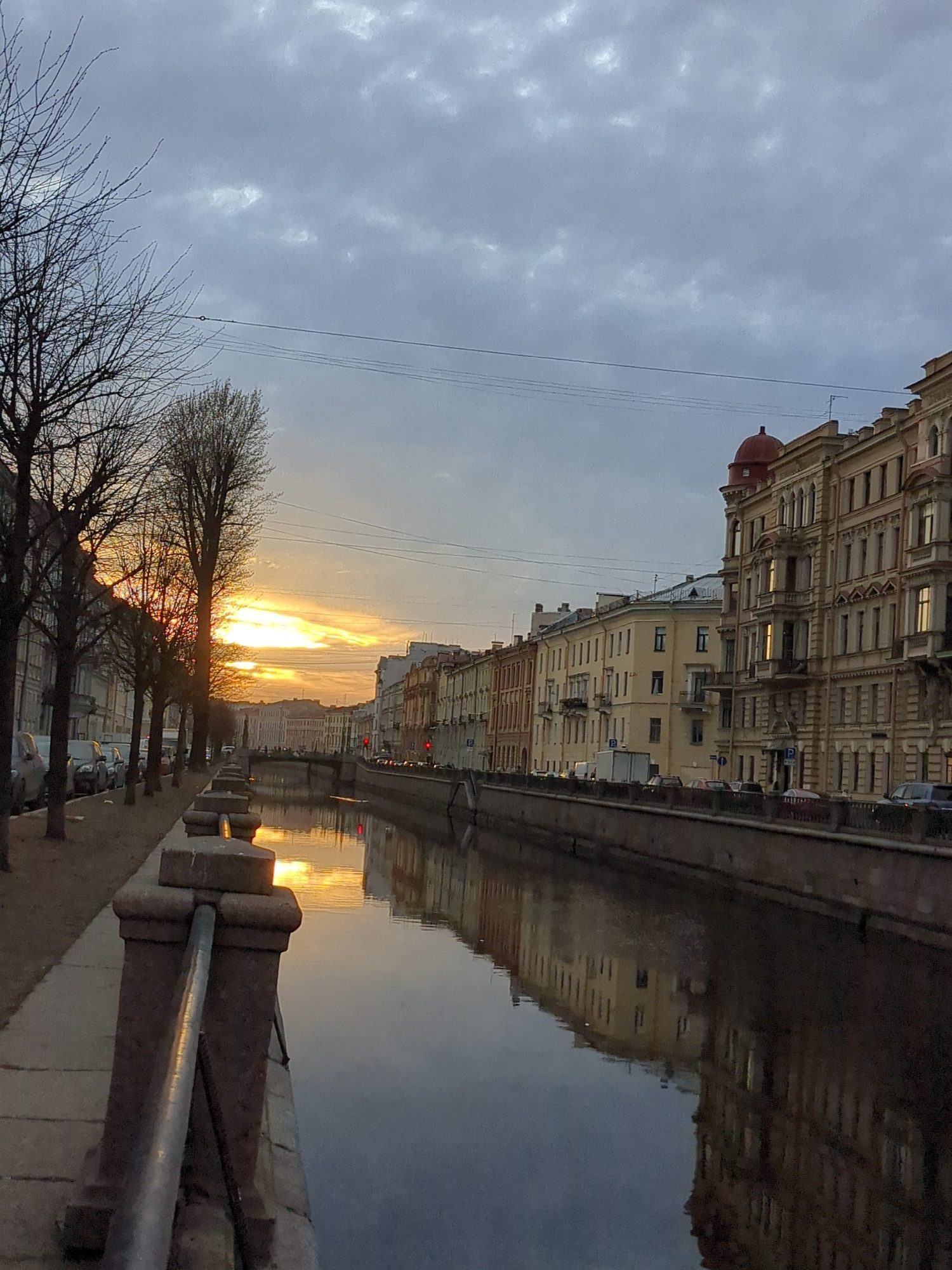 The image shows a canal in Saint Petersburg, Russia, at sunset. The sky is filled with gray clouds, but the setting sun casts a golden glow on the buildings lining the canal. The buildings are reflect…read more