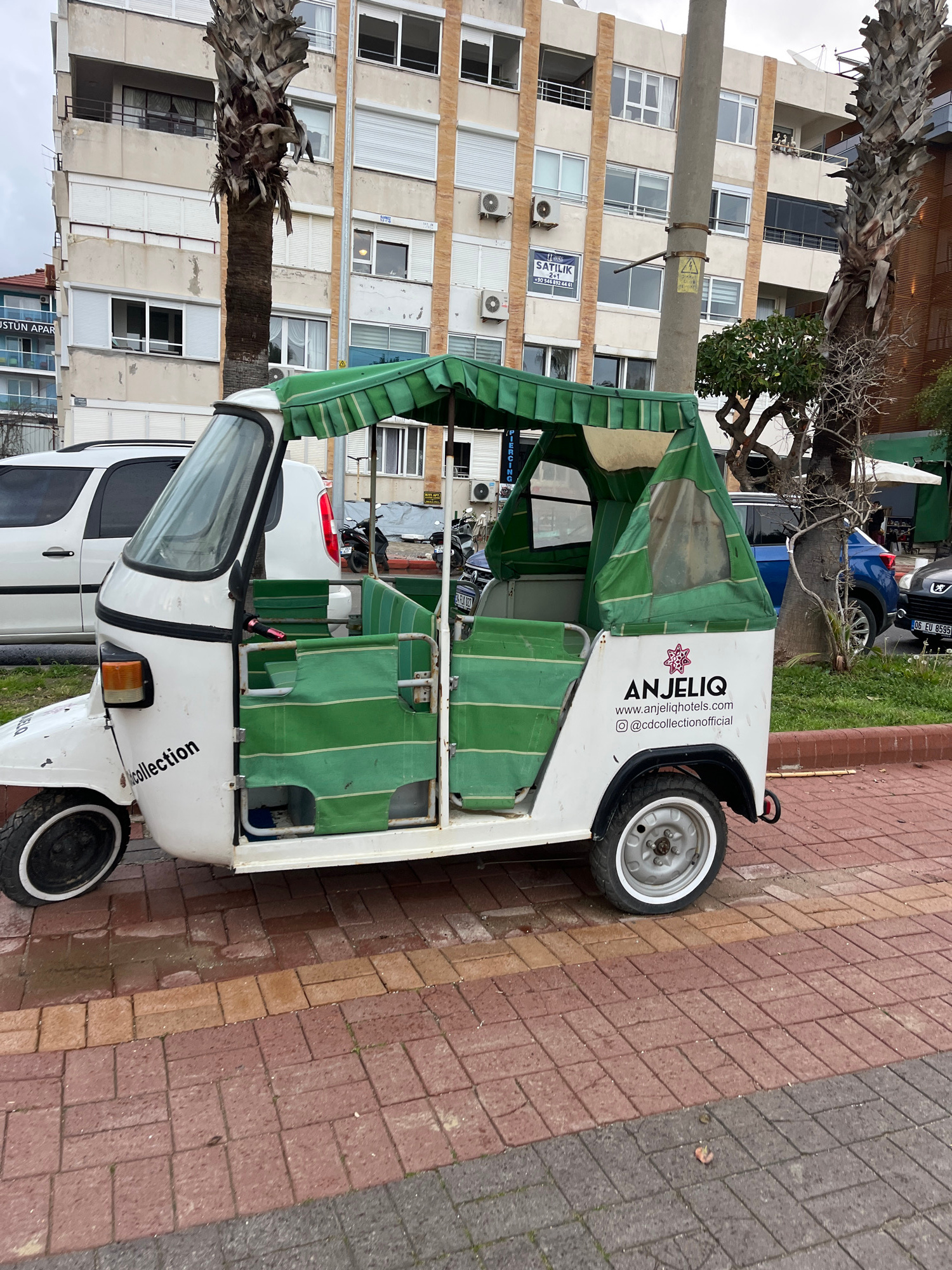 The image shows a white motorized tricycle with a green striped roof and seats, parked on a sidewalk paved with red bricks. The tricycle displays the logo of "ANJELIQ" with the website "www.anjeliqhot…read more