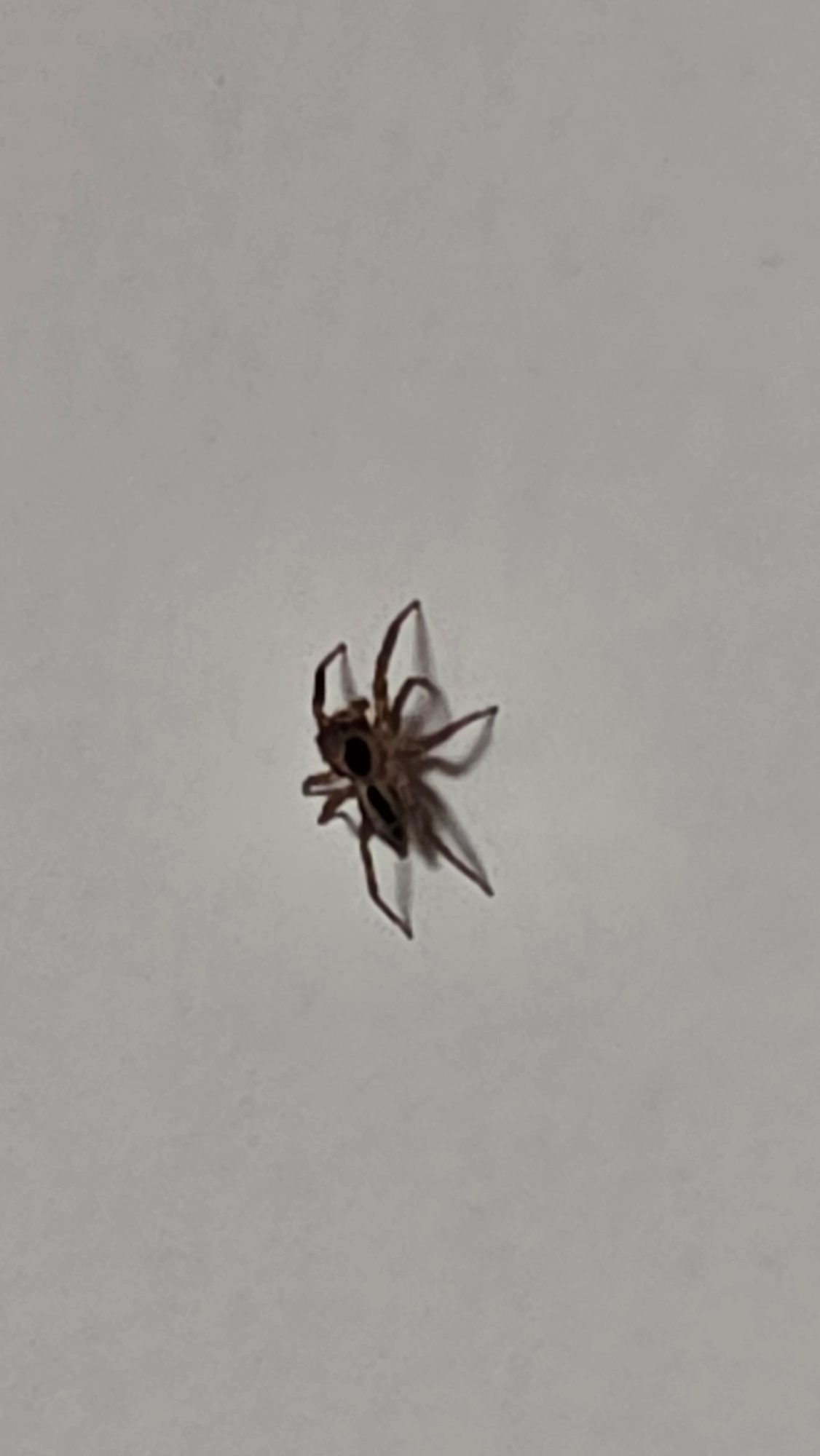 A spider is seen from underneath, resting on a light-colored, smooth surface. The spider's legs are spread out, and its body is visible in the center. The background is blurred, providing no discernib…read more