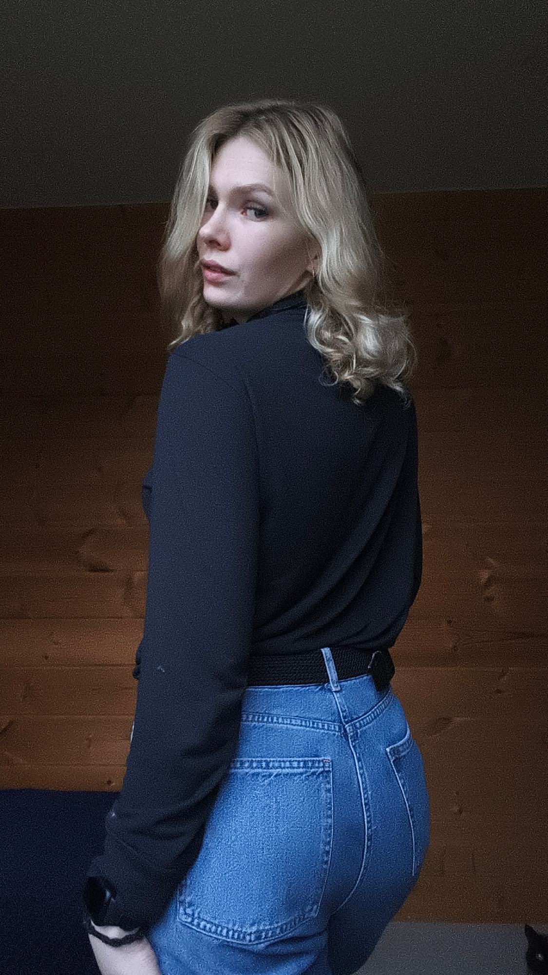 A young woman with blonde, shoulder-length hair is posing indoors. She is turned slightly to her right, looking back over her shoulder towards the viewer. She is wearing a long-sleeved black top and b…read more