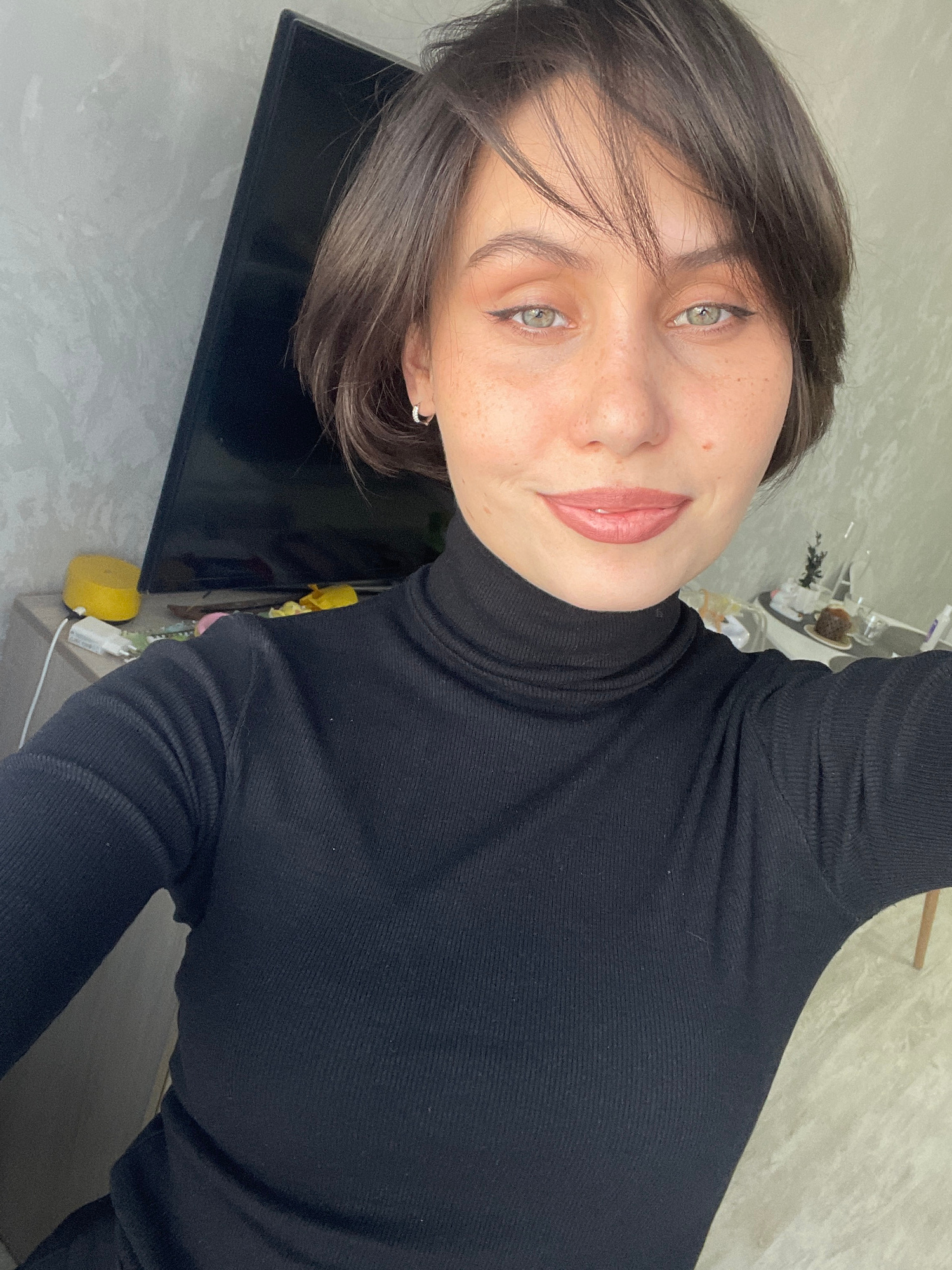 A portrait-oriented photograph, rotated approximately 90 degrees counter-clockwise, captures a young adult woman with short, dark brown hair and light green eyes. She is positioned in the foreground,…read more