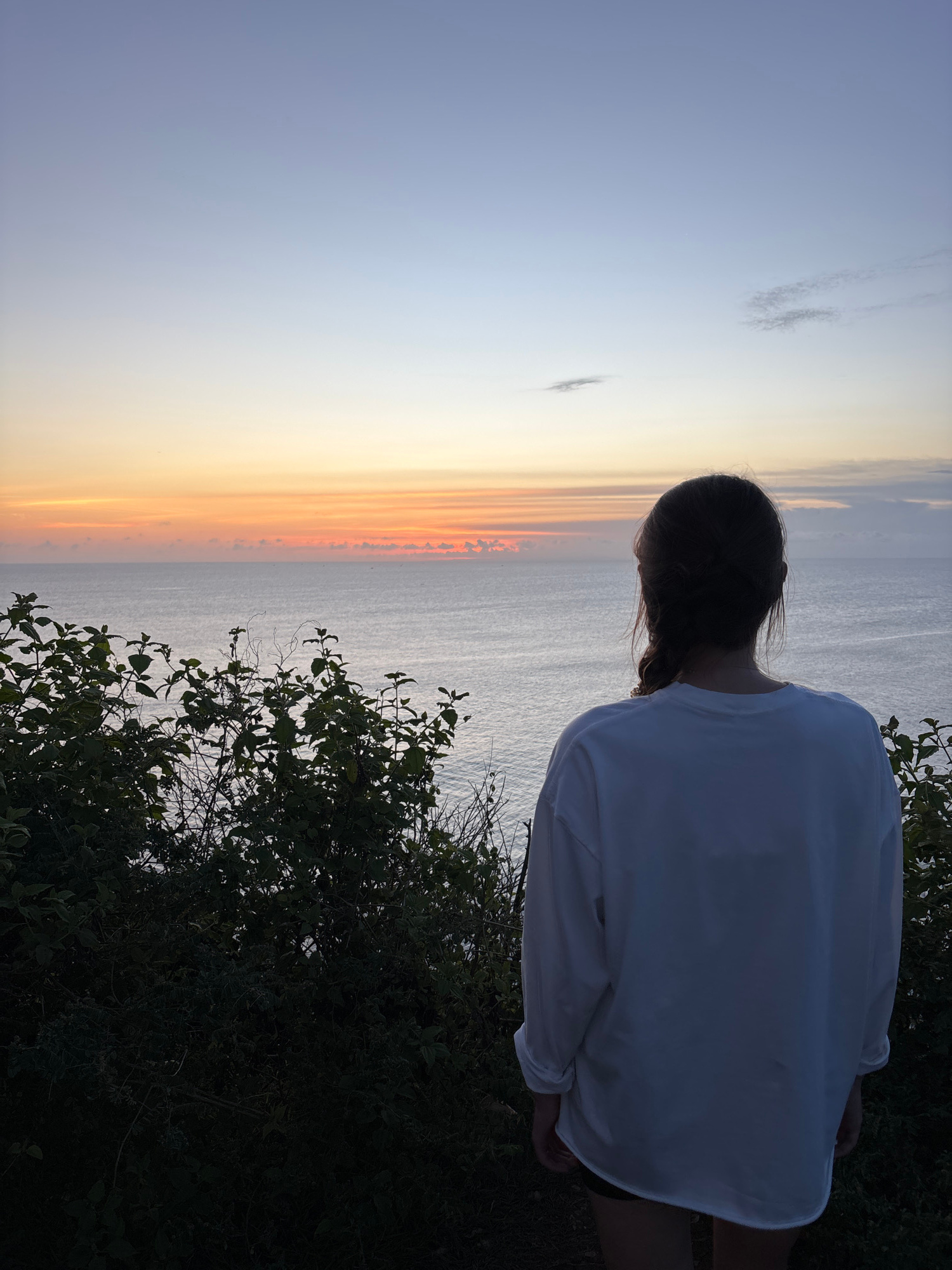 A woman with dark hair is standing on a cliff in Pecatu, Indonesia. She is facing away from the camera, overlooking the ocean. She is wearing a white long-sleeved shirt. The sky is a gradient of colorβ¦read more