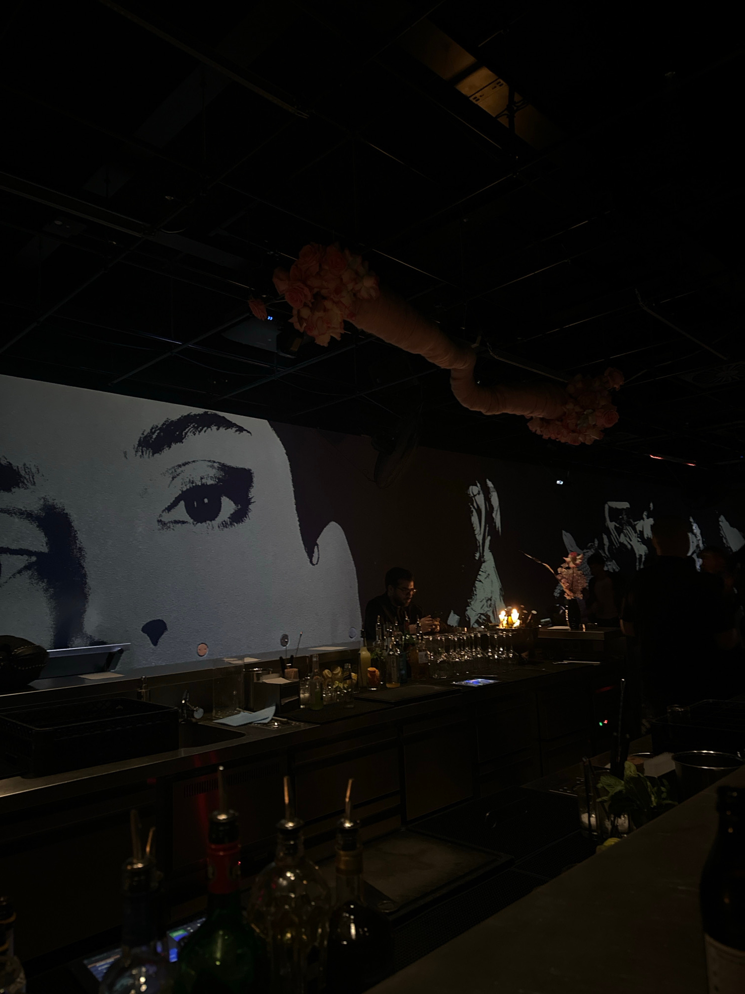 The image captures a dimly lit interior, likely a bar or lounge, presented on its side as if taken in portrait orientation and not rotated. The central focus is a large, monochrome projection of a hum…read more