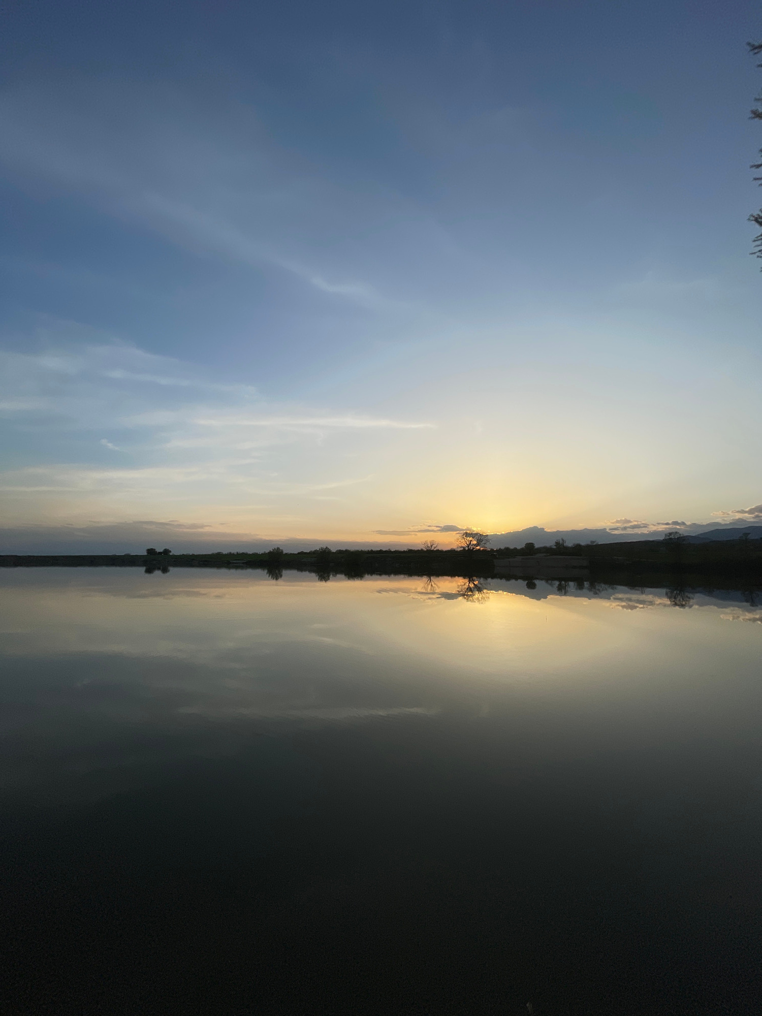 The image shows a mirrored view of a landscape, possibly a lake or reflective body of water, at sunset. The sky on the left transitions from blue to yellow near the horizon. A line of trees or vegetat…read more