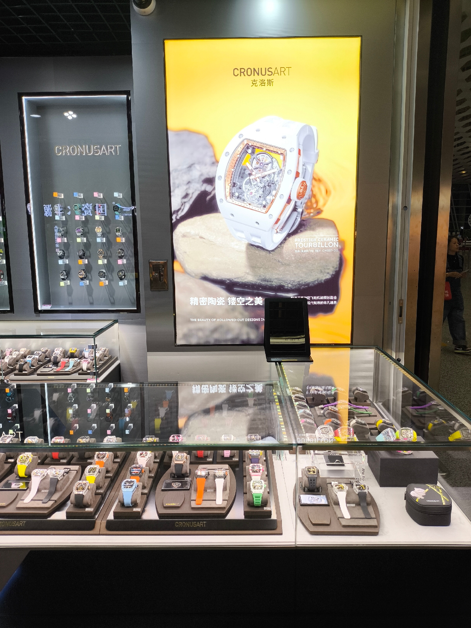 The image depicts a storefront display of watches, likely located in the Bao'an District, China. Two large illuminated signs feature the brand "CRONUSART," one showcasing a white ceramic tourbillon w…read more