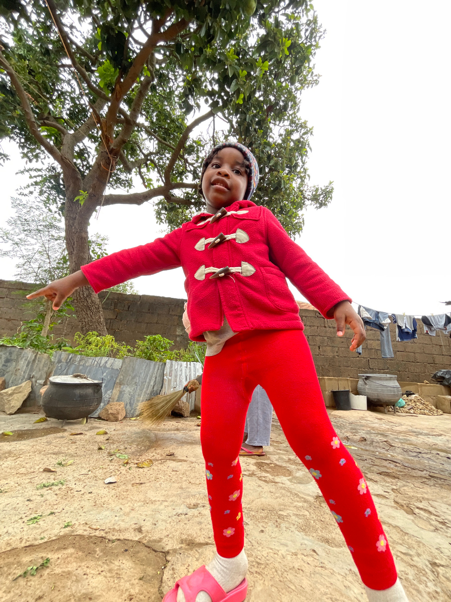A young girl wearing a red jacket, red floral leggings, and a patterned beanie stands in an outdoor environment. She is gesturing with both hands. A tree with green leaves is positioned to her left. B…read more