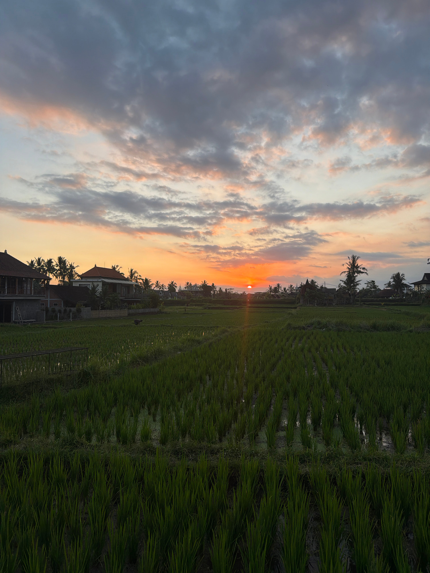 The image captures a vibrant sunset over a landscape of rice paddies, likely in Tegallalang, Indonesia, based on the context. In the foreground, lush green rice paddies stretch across the lower and l…read more