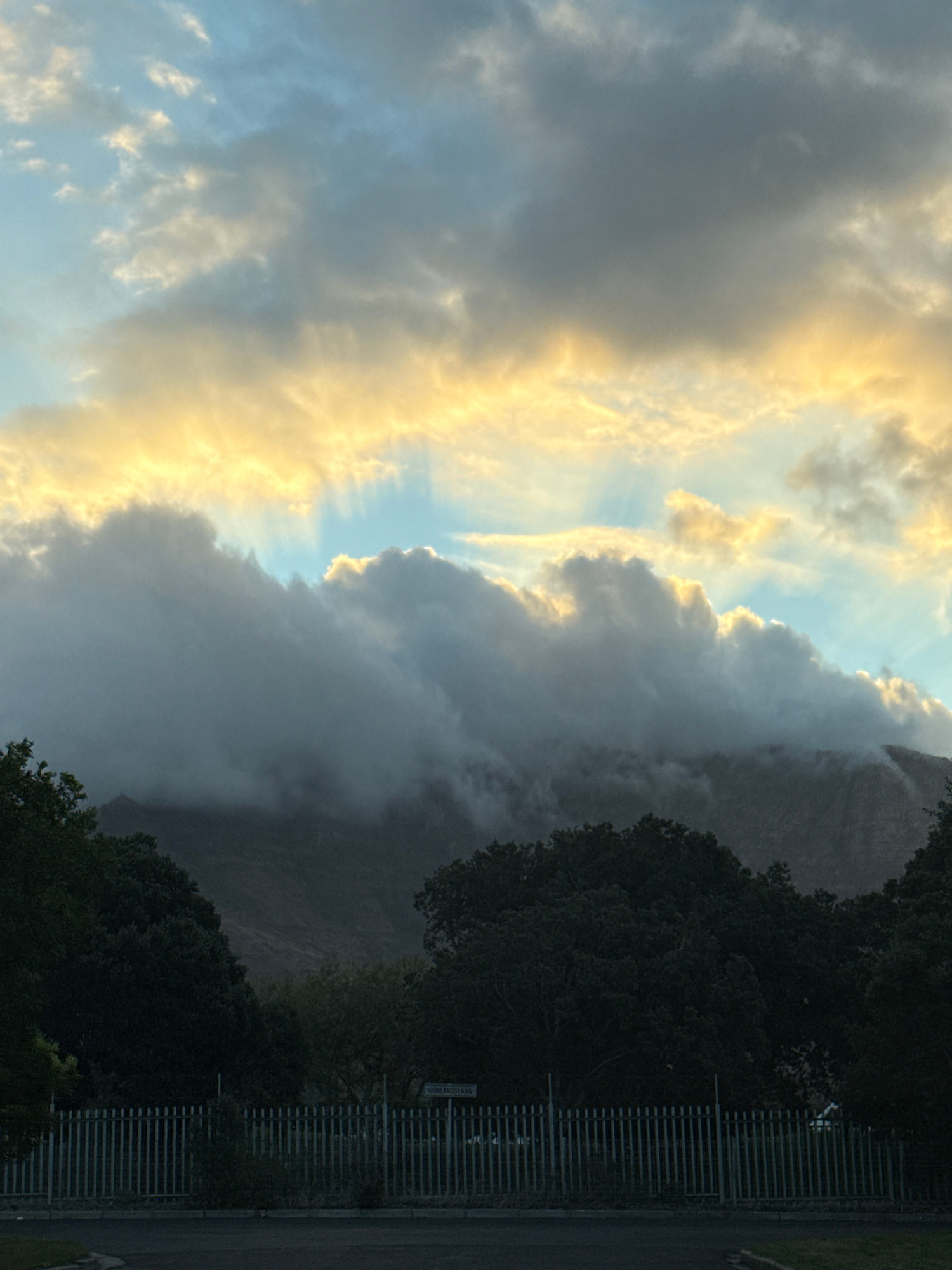 The image presents a view of clouds over what appears to be a mountainside in Cape Town, South Africa. The sky features a mix of grey and gold-tinged clouds, with glimpses of blue sky. The mountainsid…read more