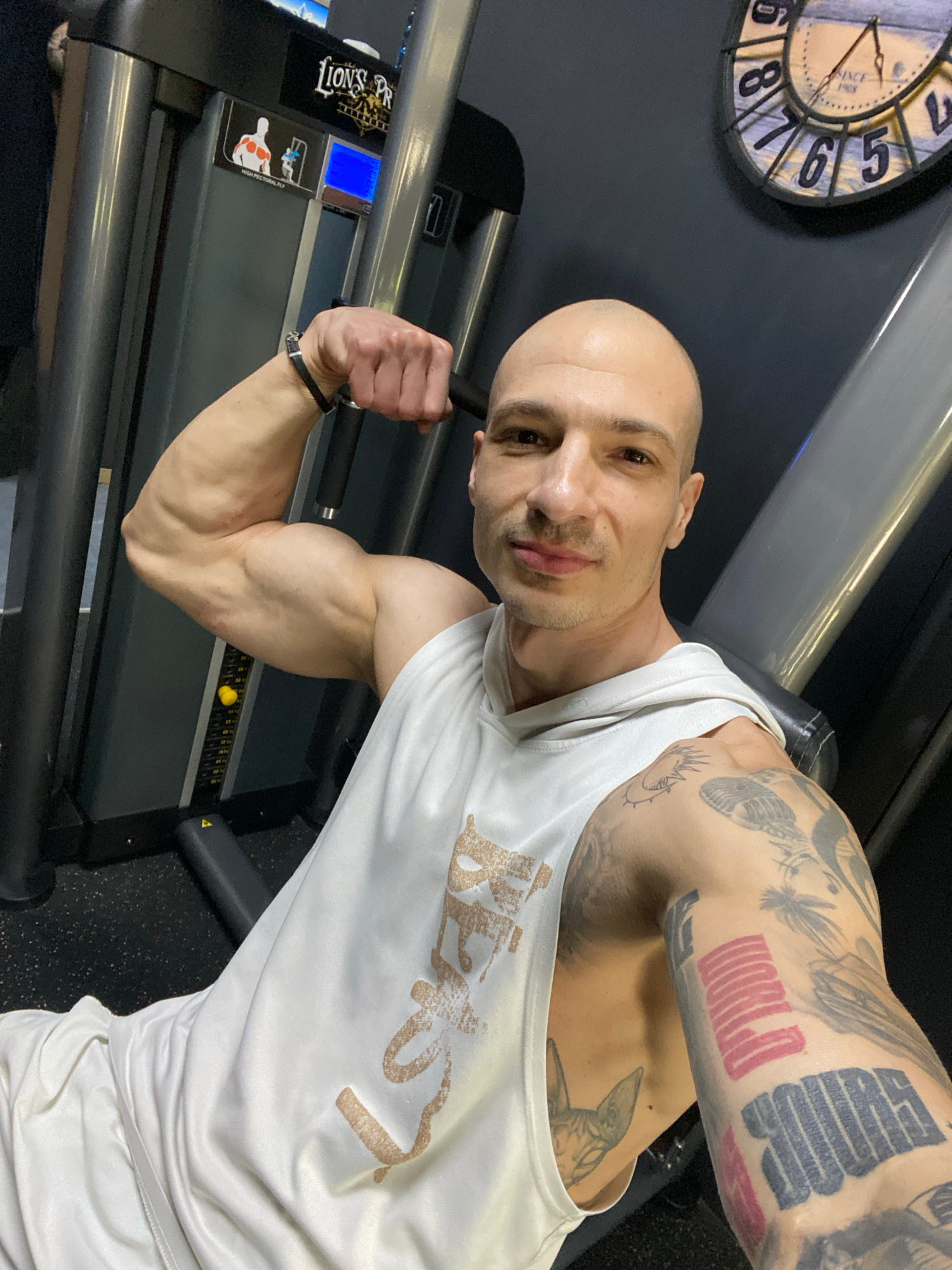 A bald, fair-skinned man is posing in what appears to be a gym. He's wearing a white hooded tank top with the word "Beast" printed on it and white shorts. He is flexing his right arm, which is heavily…read more