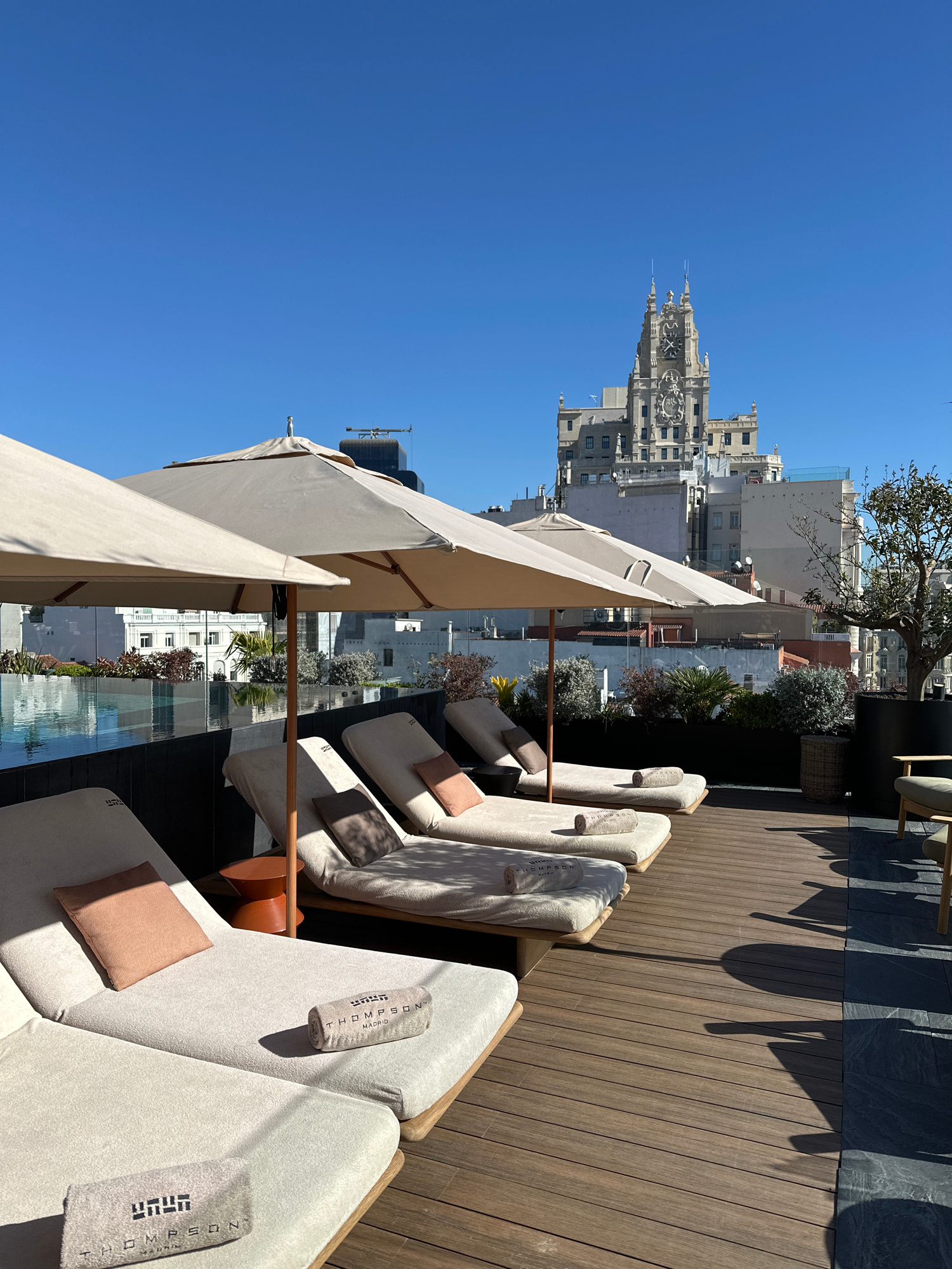 The image depicts an outdoor rooftop setting, likely a hotel or resort, in Madrid, Spain. Several lounge chairs are arranged on a wooden deck, each with a beige cushion, a small pillow, and a rolled-u…read more