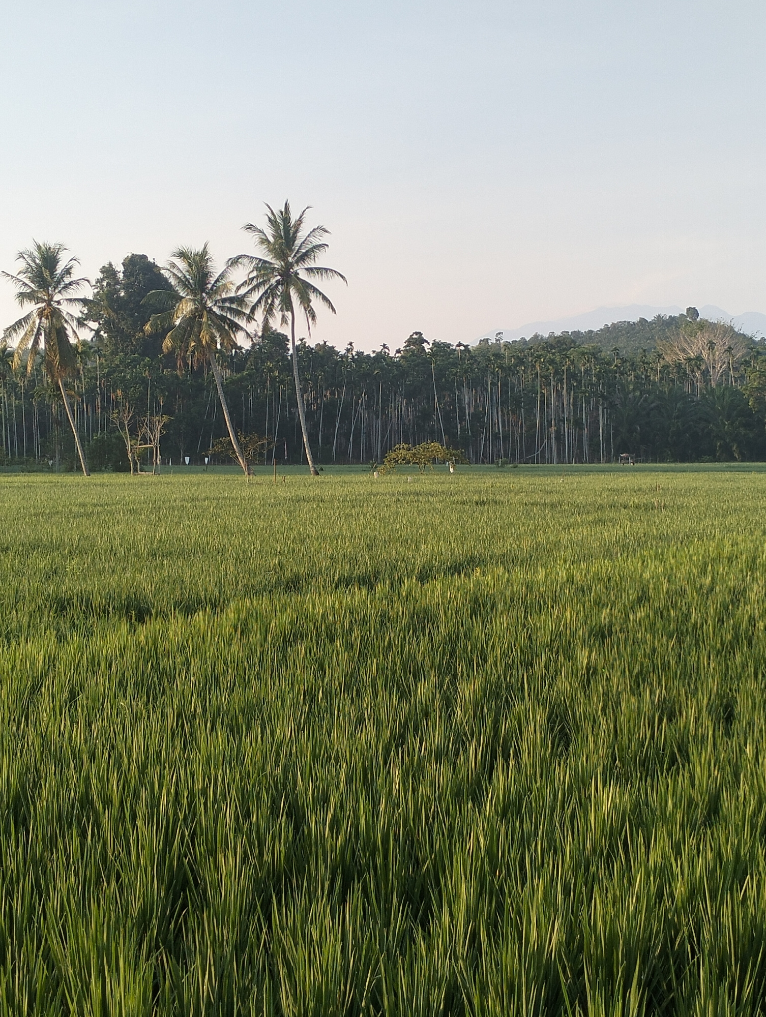 The image displays an expansive agricultural landscape in Meunasahalue, Indonesia, under a clear, pale blue to white sky. The foreground is filled with a dense, uniformly green field of tall, slender-…read more