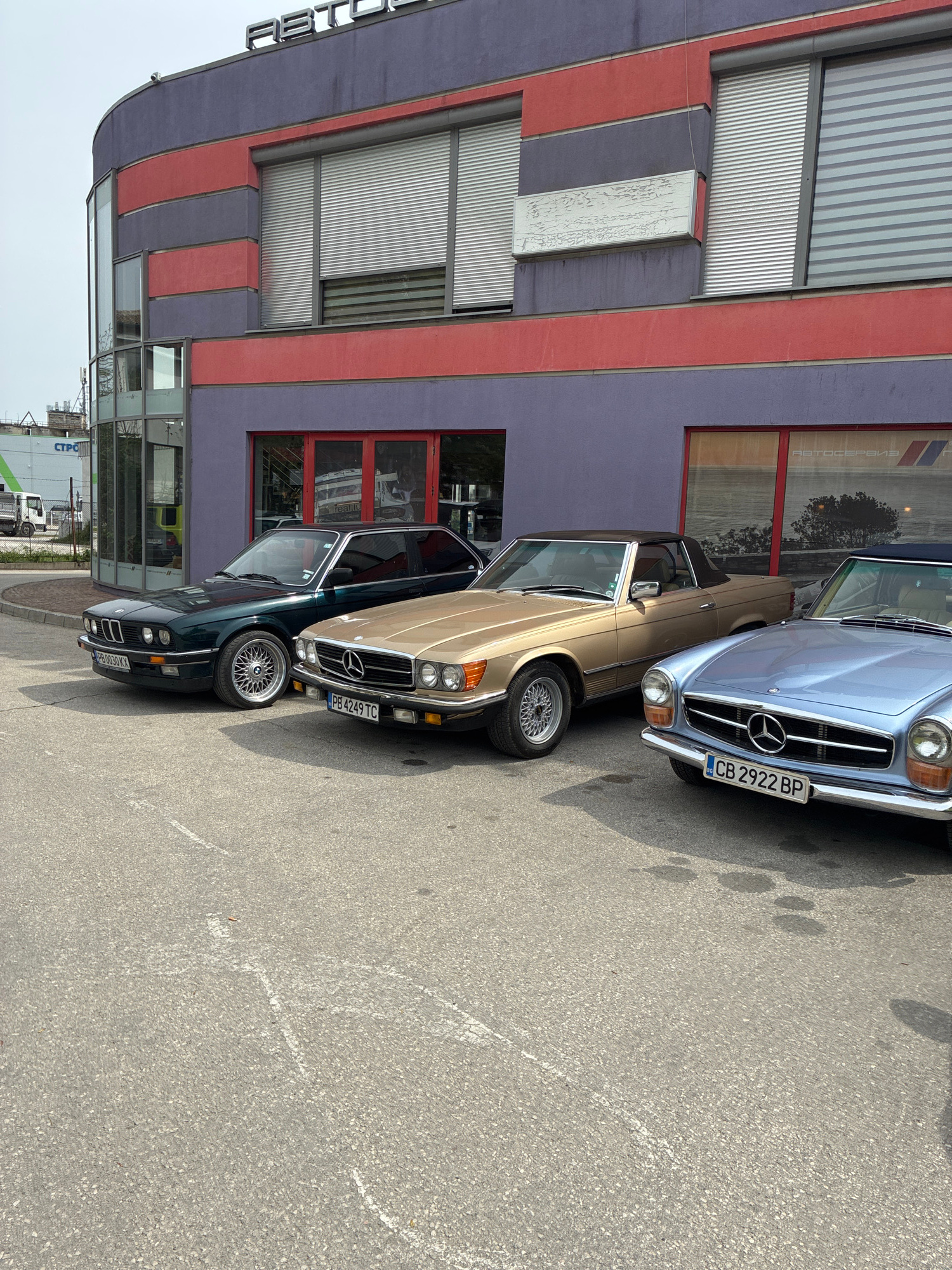 The image captures an outdoor scene featuring three classic cars parked in front of a modern building, likely in Plovdiv, Bulgaria. The time of day appears to be bright and sunny, indicated by clear l…read more