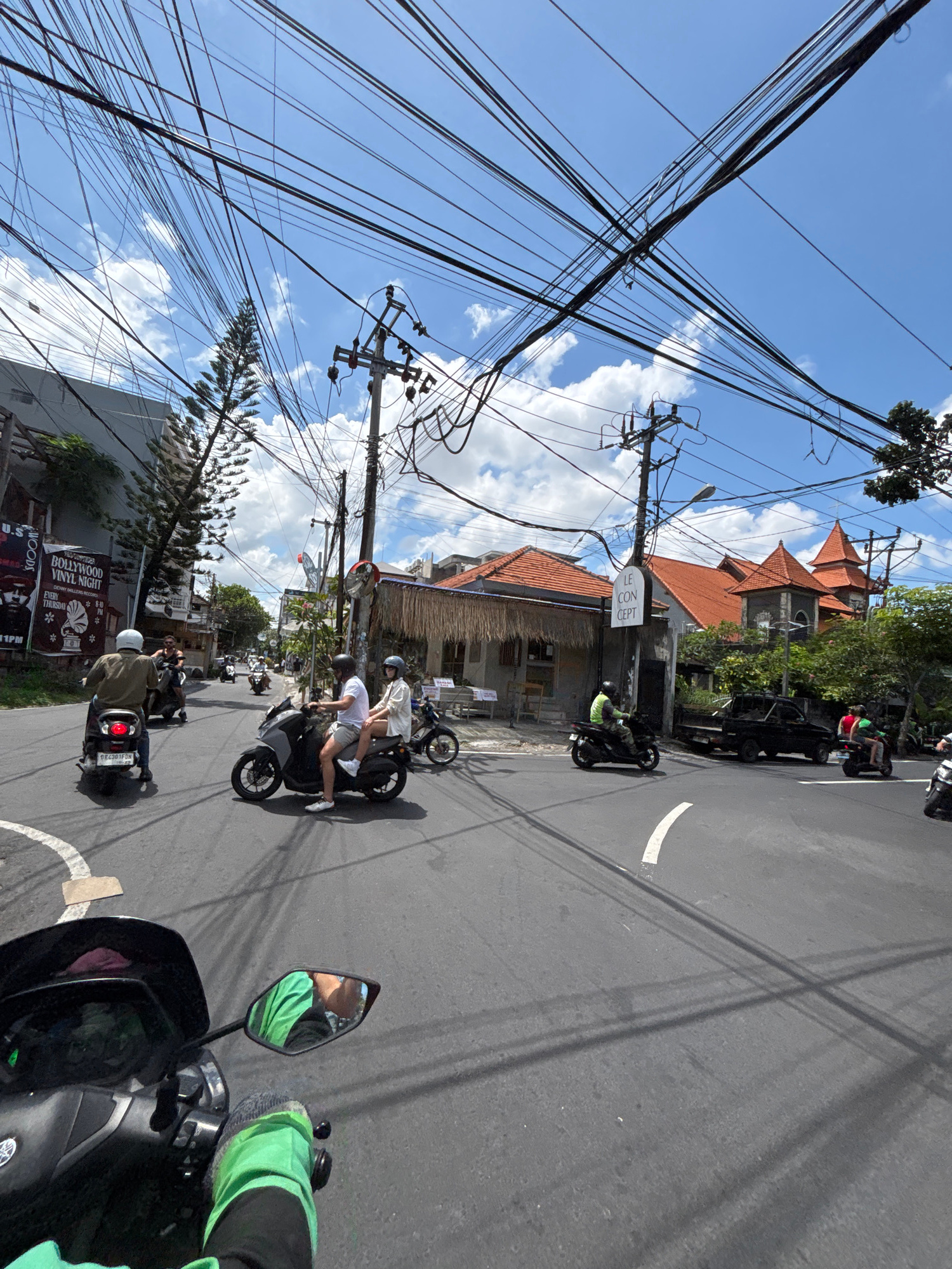 The image depicts a street scene in North Kuta, Indonesia, taken from the perspective of a rider on a motorcycle. The road is asphalt with white lane markings and tire tracks. Several motorcycles areβ¦read more