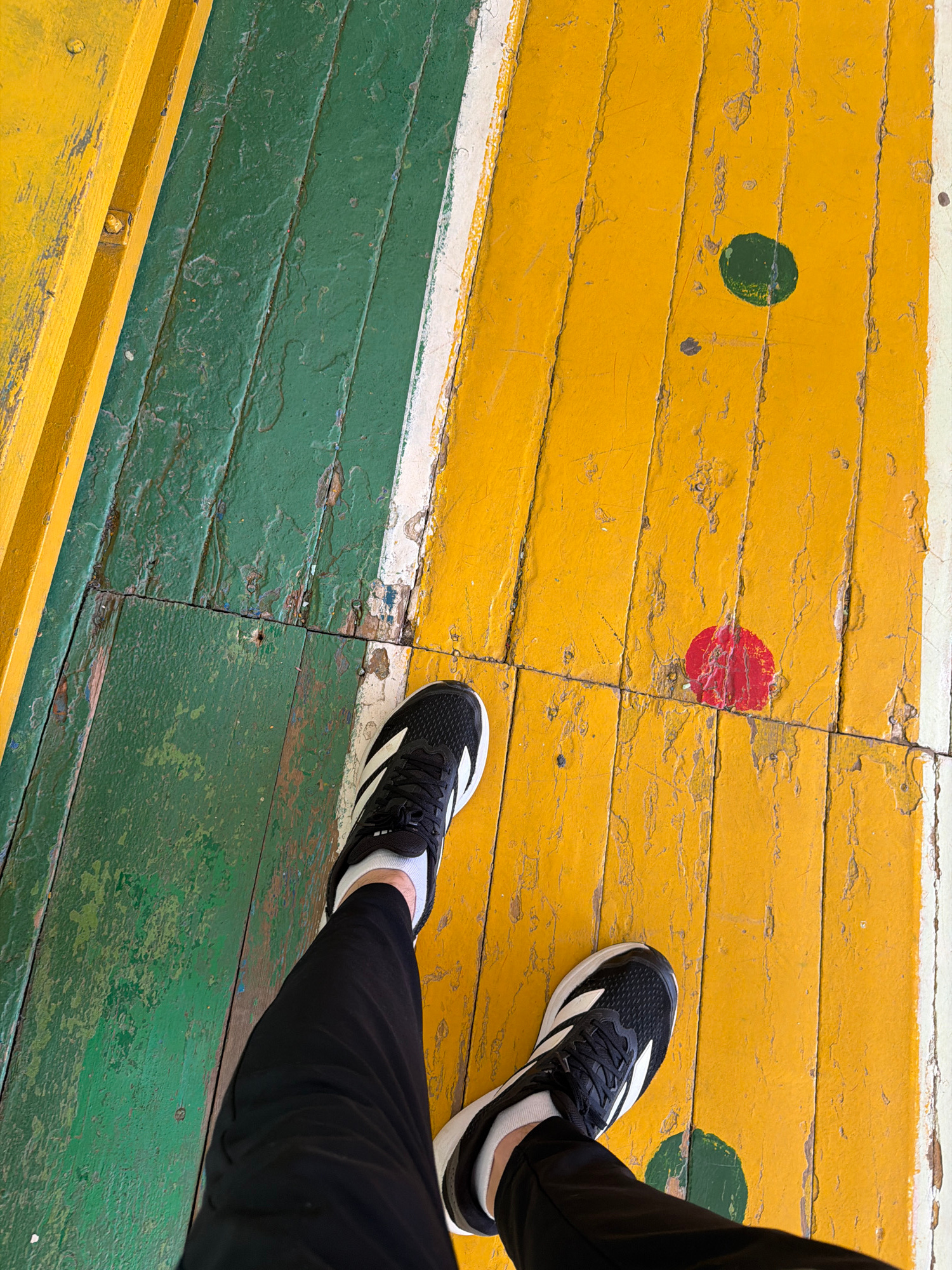 The image shows a person standing on a painted wooden surface. The surface is composed of planks arranged horizontally. The planks are painted in alternating stripes of yellow, green, and white. Sever…read more