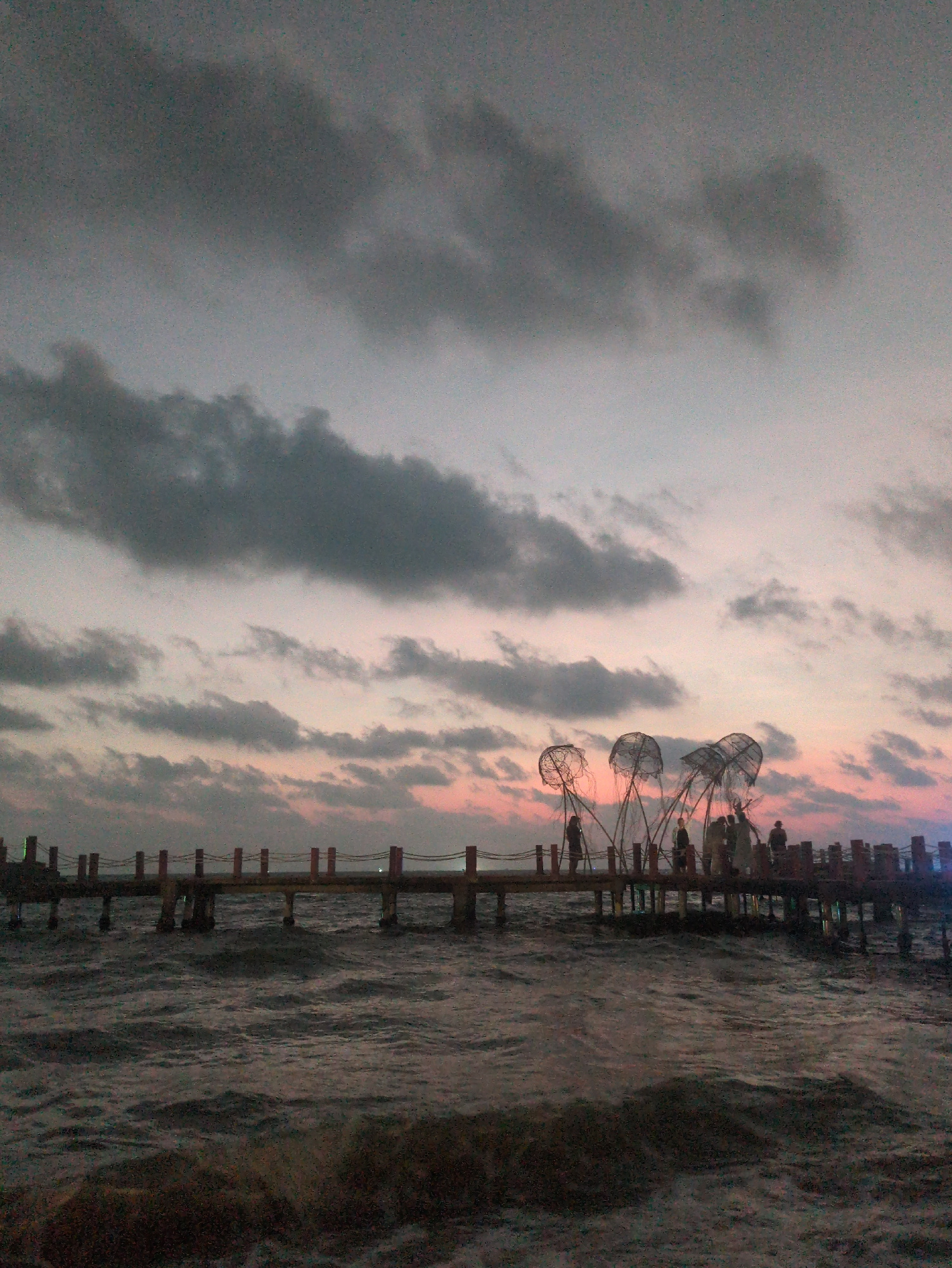 The image shows a pier stretching into the ocean, likely in Phú Quốc, Vietnam. The pier is constructed of dark wood. The sky is filled with clouds, with a gradient of grey to pink hues as the sun sets…read more