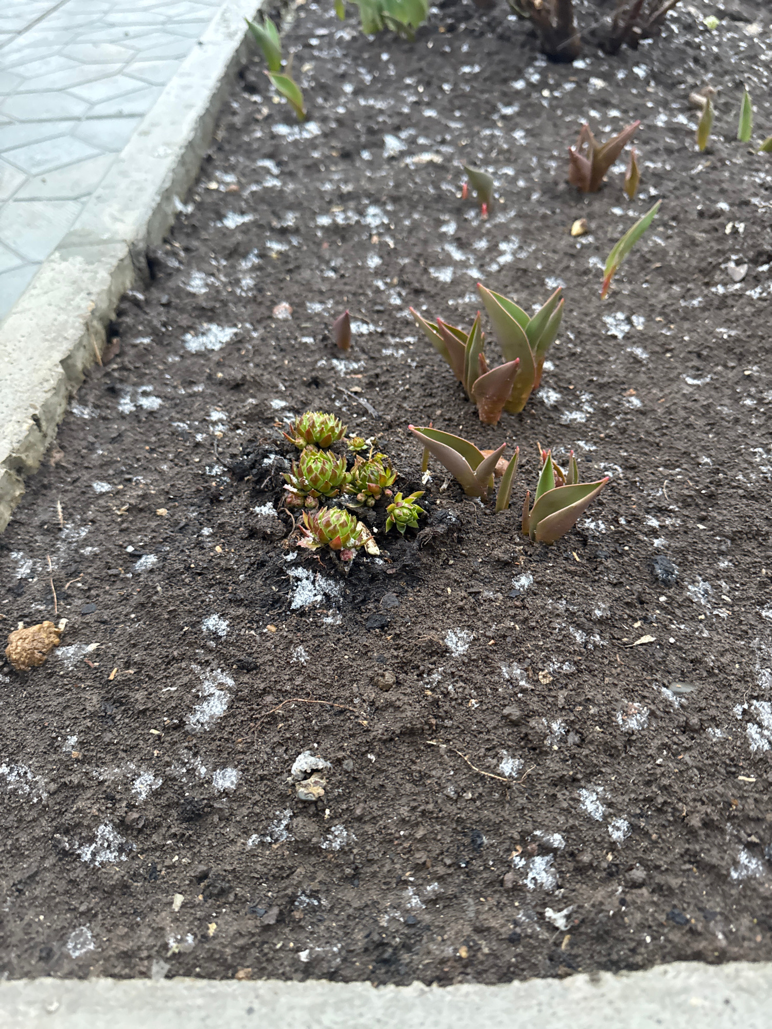 The image shows a close-up view of plants growing in a patch of dark soil. The plants include Sempervivum tectorum (common houseleek) and another type with reddish-tinged, lanceolate leaves. The soil…read more