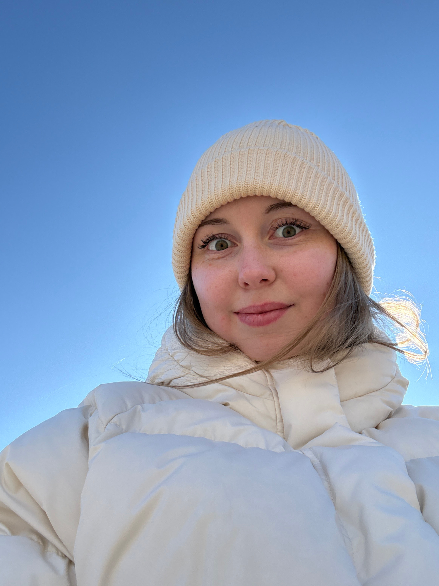A woman with fair skin and light brown hair is pictured from a low angle, looking down at the camera. She is wearing a cream-colored knit beanie and a puffy, off-white jacket. The backdrop is a clear…read more