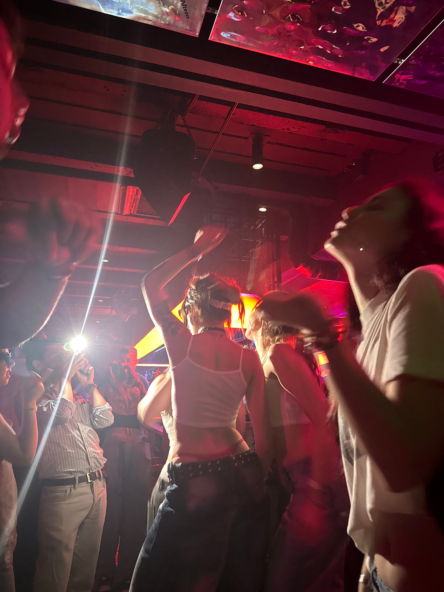 The image captures a vibrant and energetic indoor scene, typical of a nightclub or music venue in Sofia, Bulgaria, taking place at night. The photograph is rotated 90 degrees clockwise, with the subje…read more