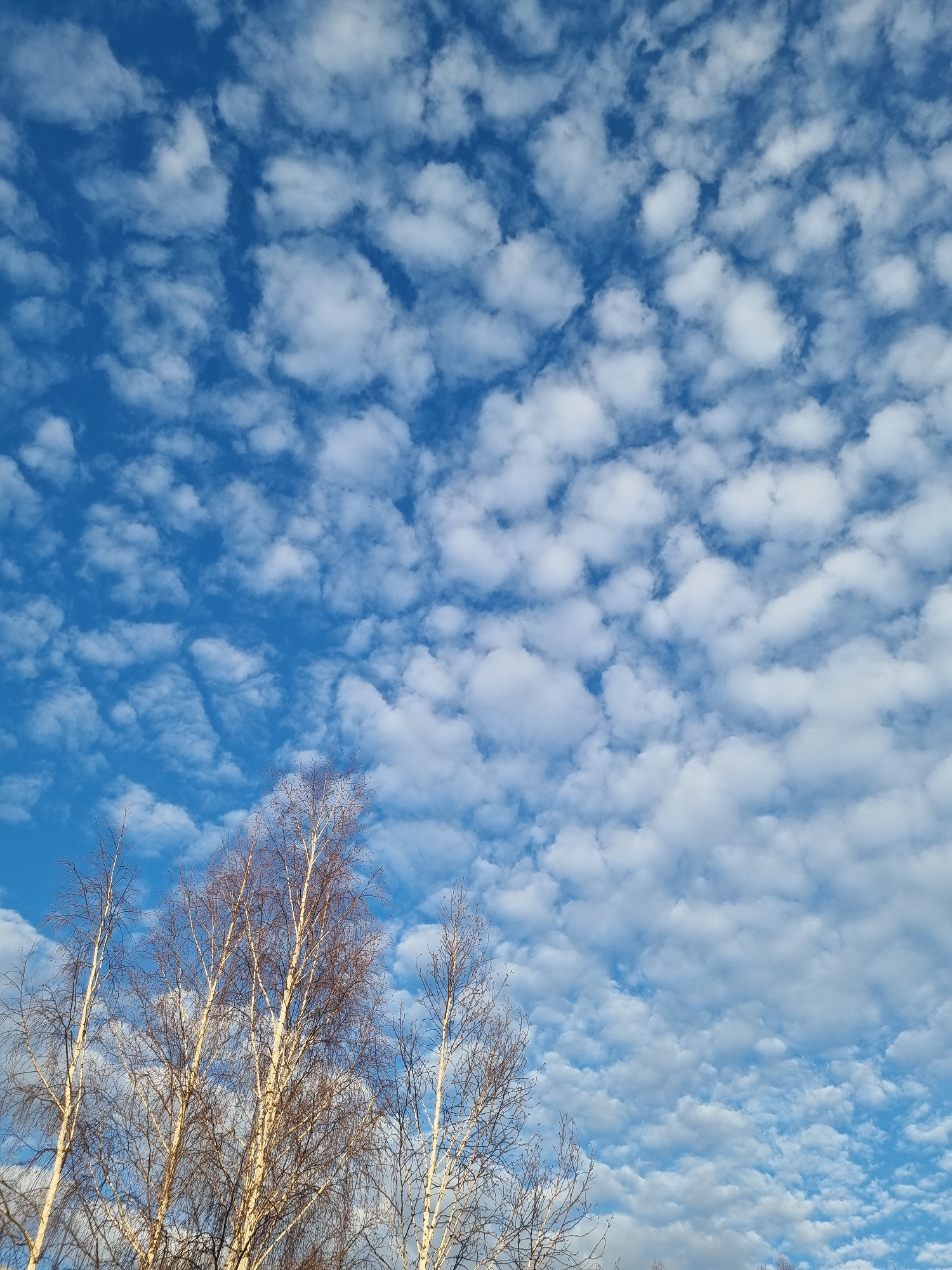 The image shows a low-angle view of the sky with scattered altocumulus clouds. In the lower right corner, the bare branches of several birch trees are visible. The sky is blue. The location is not dis…read more
