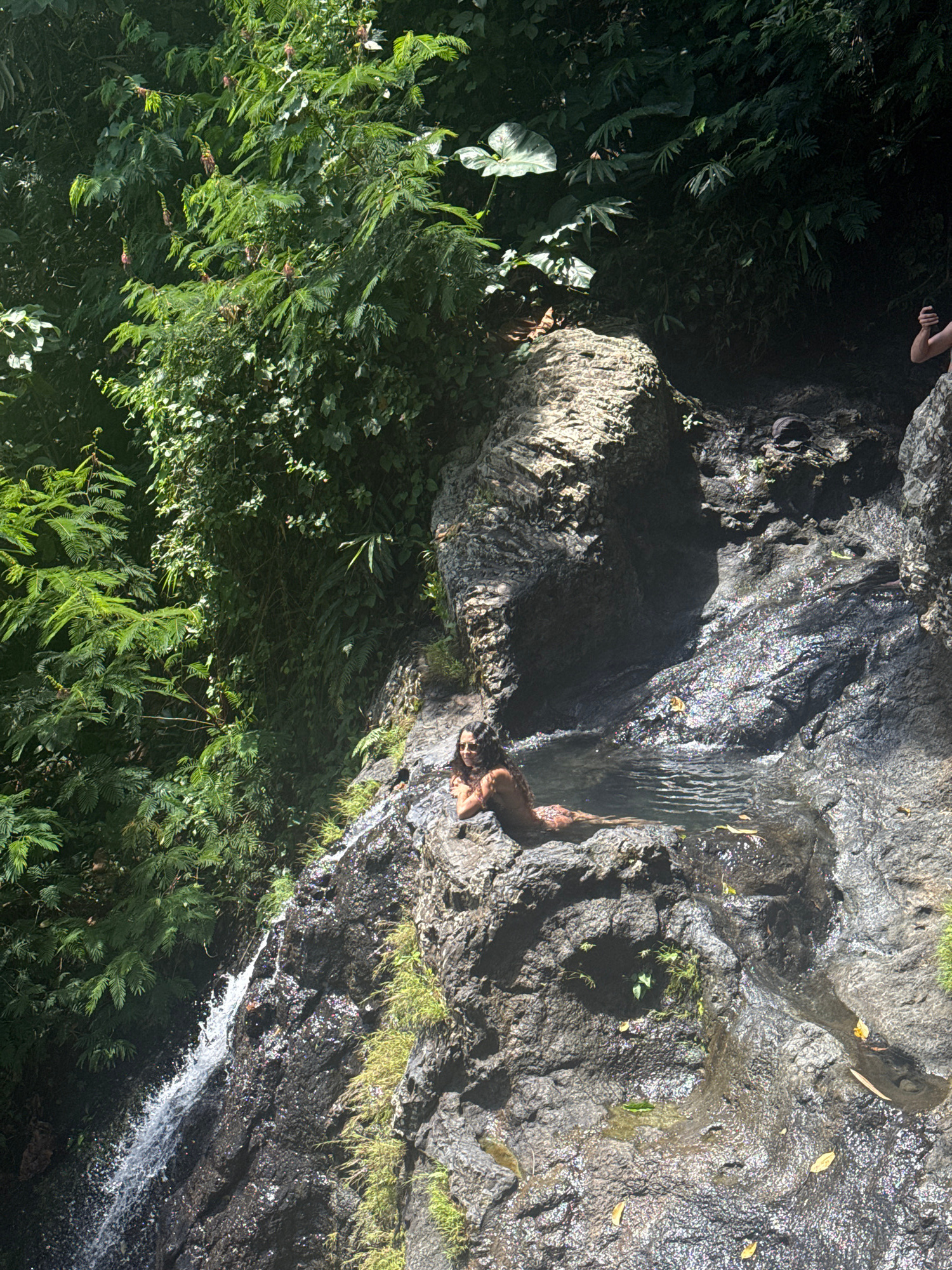 The image captures a vibrant, natural scene from a high-angle perspective, showcasing a person interacting with a rocky stream or waterfall amidst dense tropical vegetation. The scene appears to be se…read more