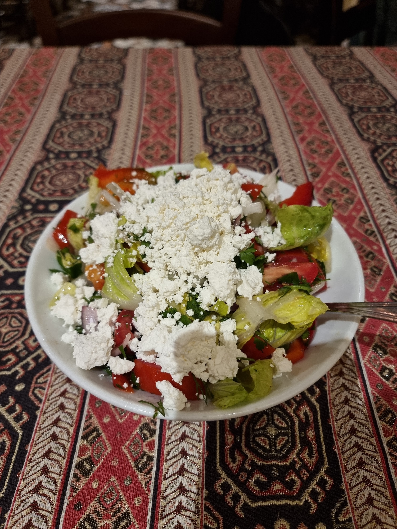 A close-up, slightly angled shot shows a white bowl filled with a salad covered in a generous amount of crumbled white cheese. The salad appears to contain lettuce, red bell peppers, and herbs. A fork…read more