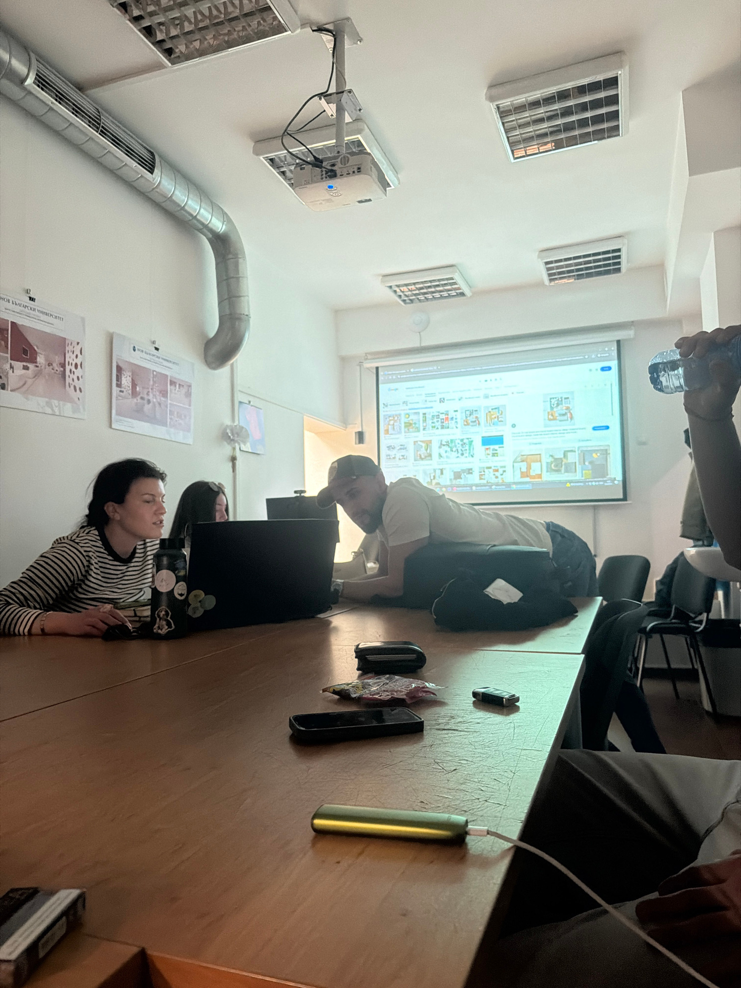 A well-lit room, possibly a classroom or office, features several individuals engaged in work or study. A young woman is seated at a wooden table, wearing a striped shirt and using a computer mouse. B…read more