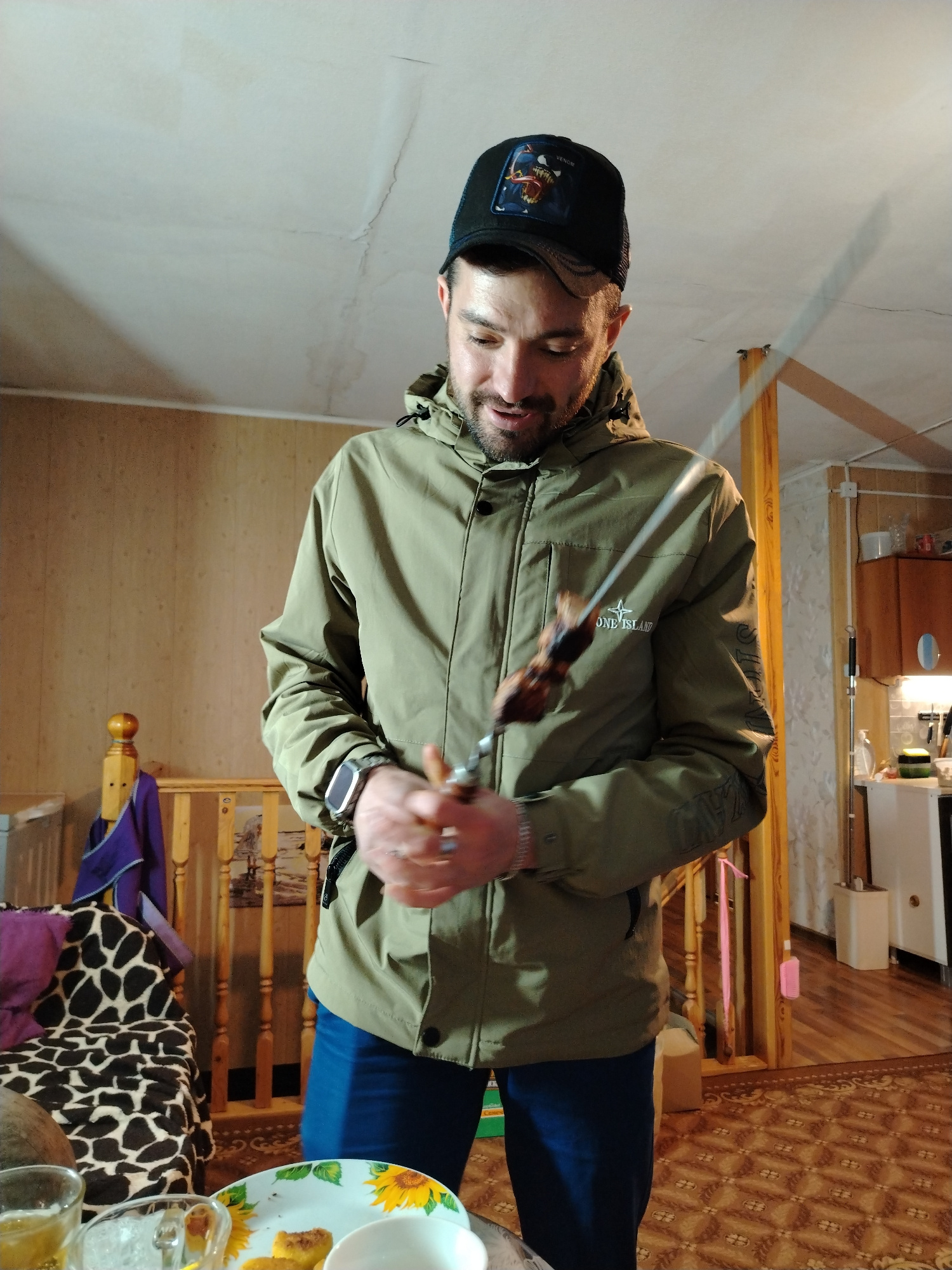 A man stands indoors, holding a skewer with cooked meat. He is wearing a dark cap with a graphic, a khaki jacket with a "Stone Island" logo, blue pants, and a wristwatch. A plate with food rests on a…read more