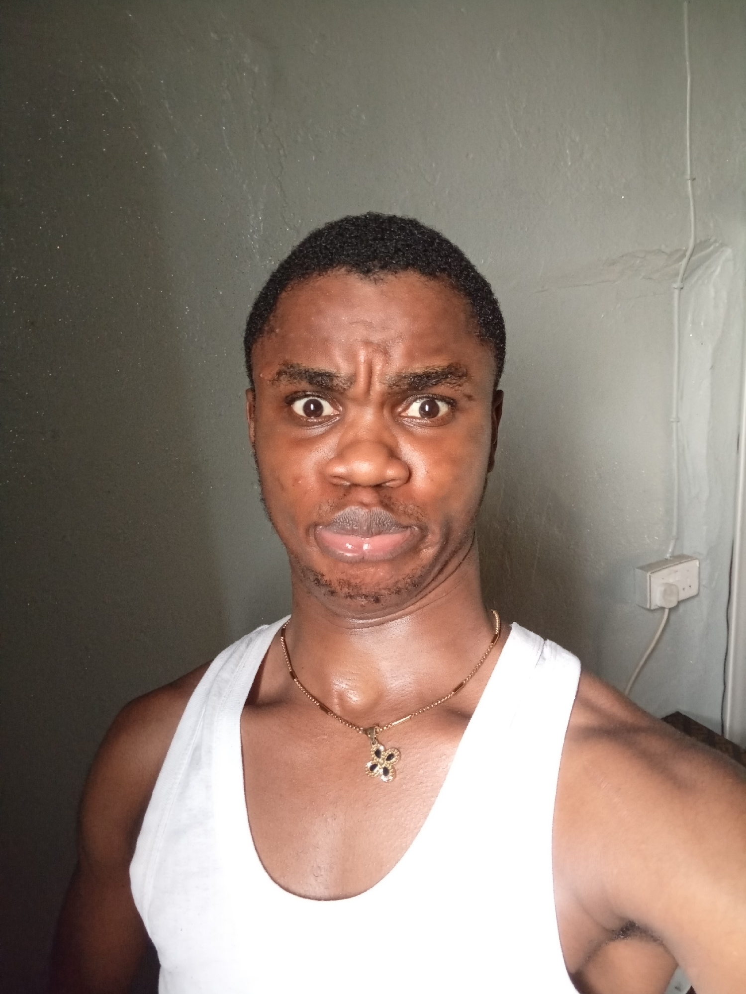 A medium shot captures a man with brown skin, a dark, short haircut, and a gold necklace with a flower pendant. He is wearing a white tank top. His facial expression is characterized by furrowed brows…read more