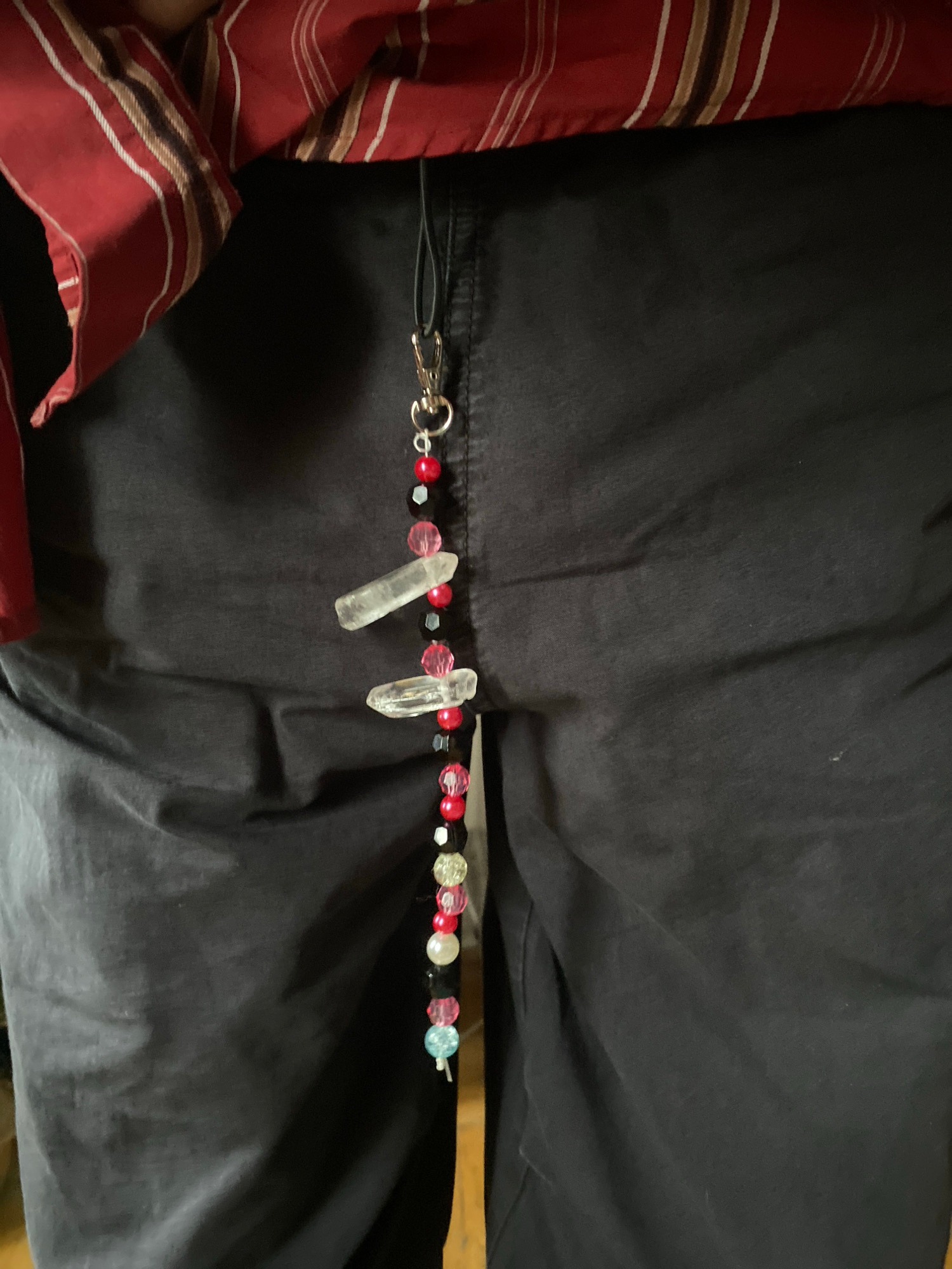 The image shows a person wearing dark pants and a red and white striped shirt. Resting on the pants is a lanyard decorated with various beads in colors like red, pink, black, and clear, as well as two…read more