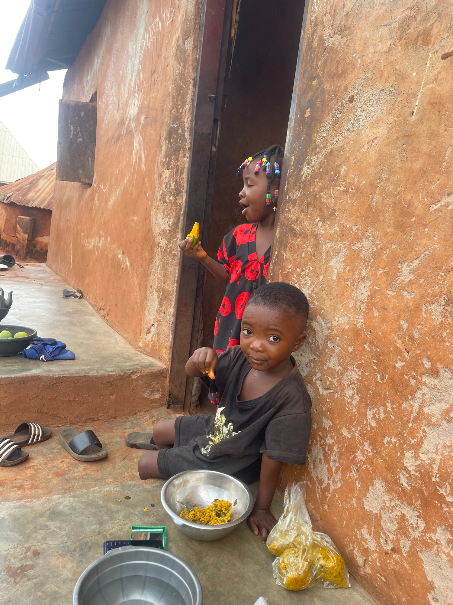 In Ogbe, Nigeria, two children are outside near a building with textured orange walls. A boy in a black t-shirt looks at the camera while holding a piece of food. Beside him is a silver bowl filled wi…read more