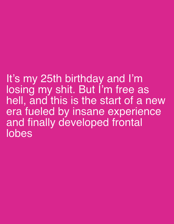 A solid magenta background features the text "It's my 25th birthday and I'm losing my shit. But I'm free as hell, and this is the start of a new era fueled by insane experience and finally developed f…read more