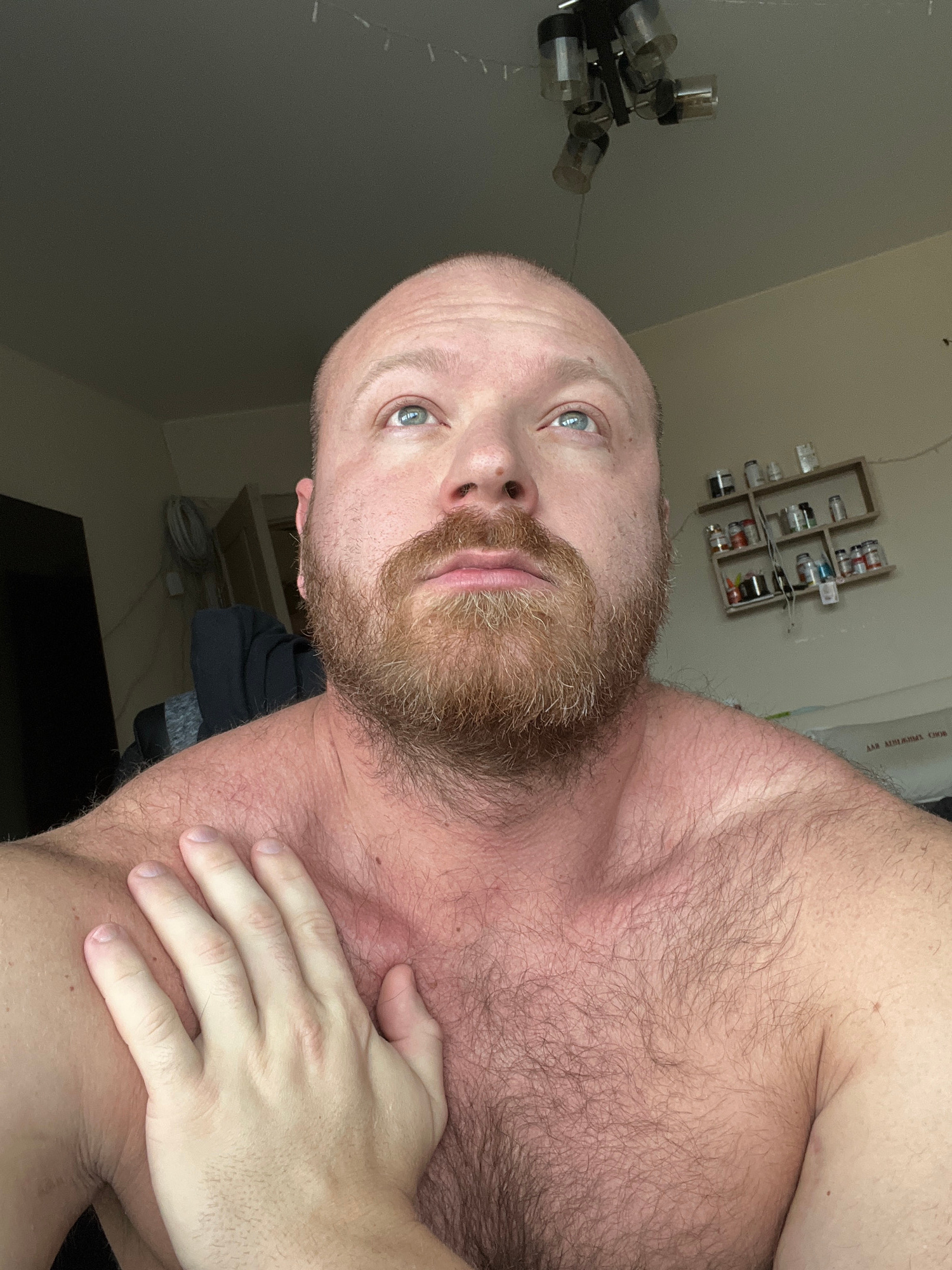 A man with a bald head and a reddish-brown beard is pictured from a low angle, seemingly a selfie. He has light skin and light-colored eyes. His upper chest and shoulder are visible, covered in hair.…read more
