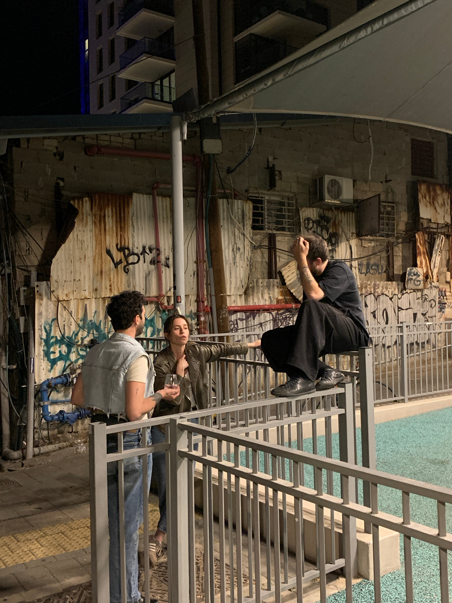 A nighttime outdoor scene features three individuals interacting on a metal staircase structure against a backdrop of weathered buildings with graffiti and various architectural elements. The location…read more