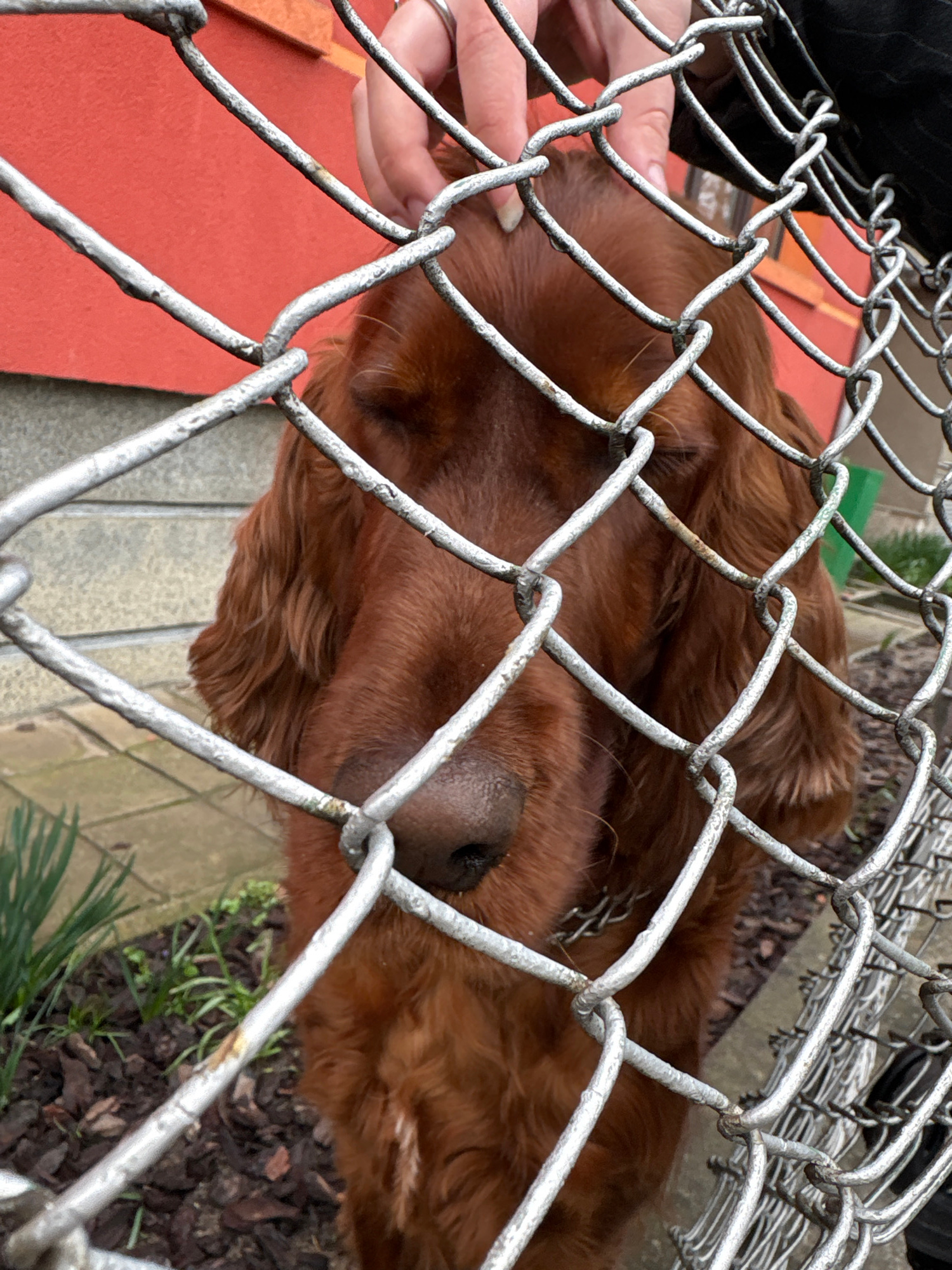An auburn Irish Setter dog lies behind a chain-link fence. The dog’s nose and the top of its head are visible. A human hand with pale skin and manicured nails reaches through the fence to pet the dog.…read more