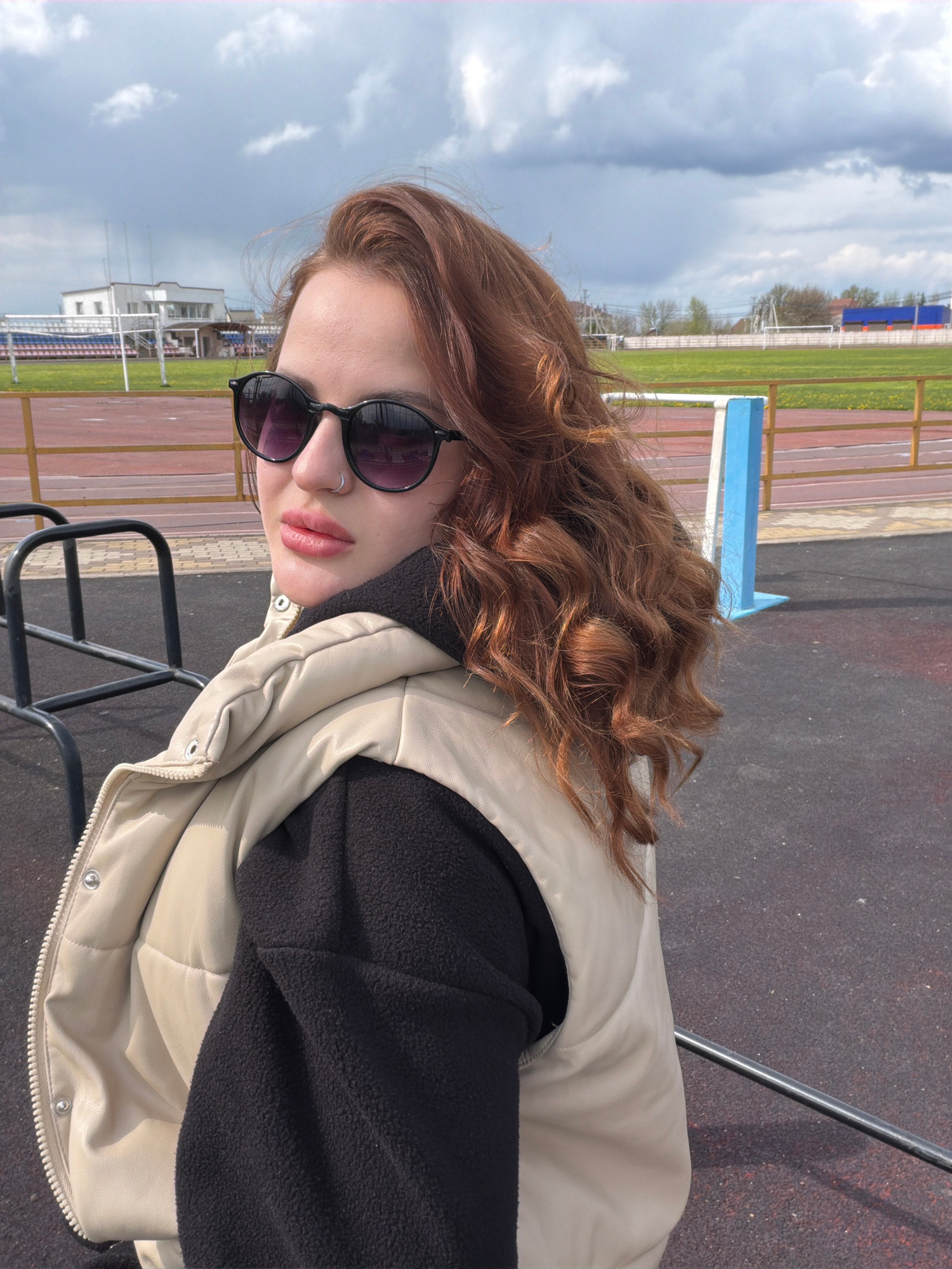 A woman with auburn hair and sunglasses is captured at an outdoor location, likely in Novopokrovskaya, Russia. The background reveals a sports field, characterized by a running track with red and brow…read more