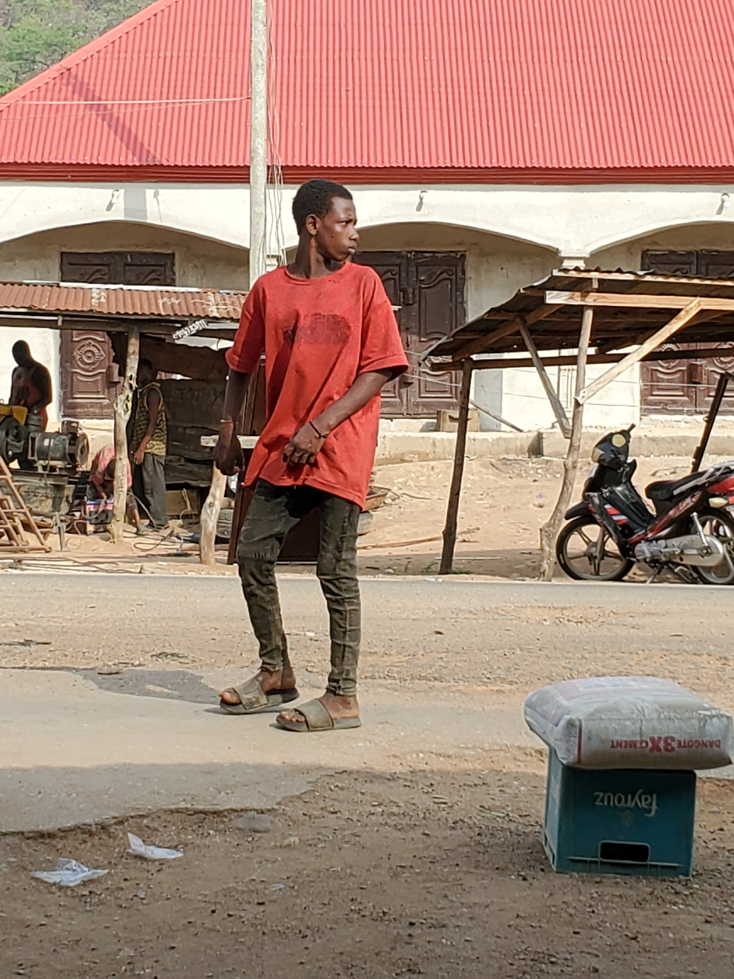 This outdoor photograph captures a street scene, likely in Mararaba, Nigeria, under bright daylight. The image is oriented vertically but depicts a horizontal ground level. In the foreground, a young…read more