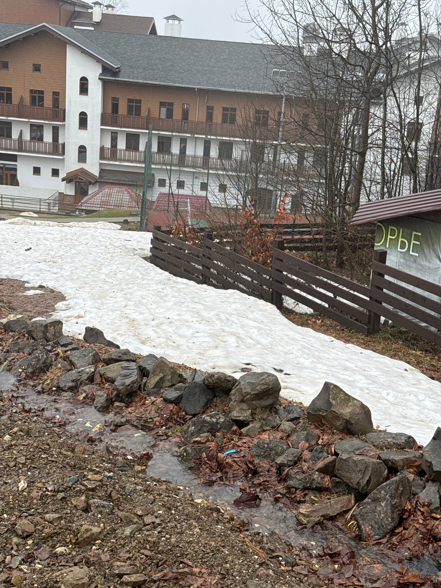 The image depicts a scene in Estosadok, Russia, characterized by the presence of snow, rocks, water, and buildings. A patch of snow runs alongside a rocky area with dead leaves. Water flows between thβ¦read more
