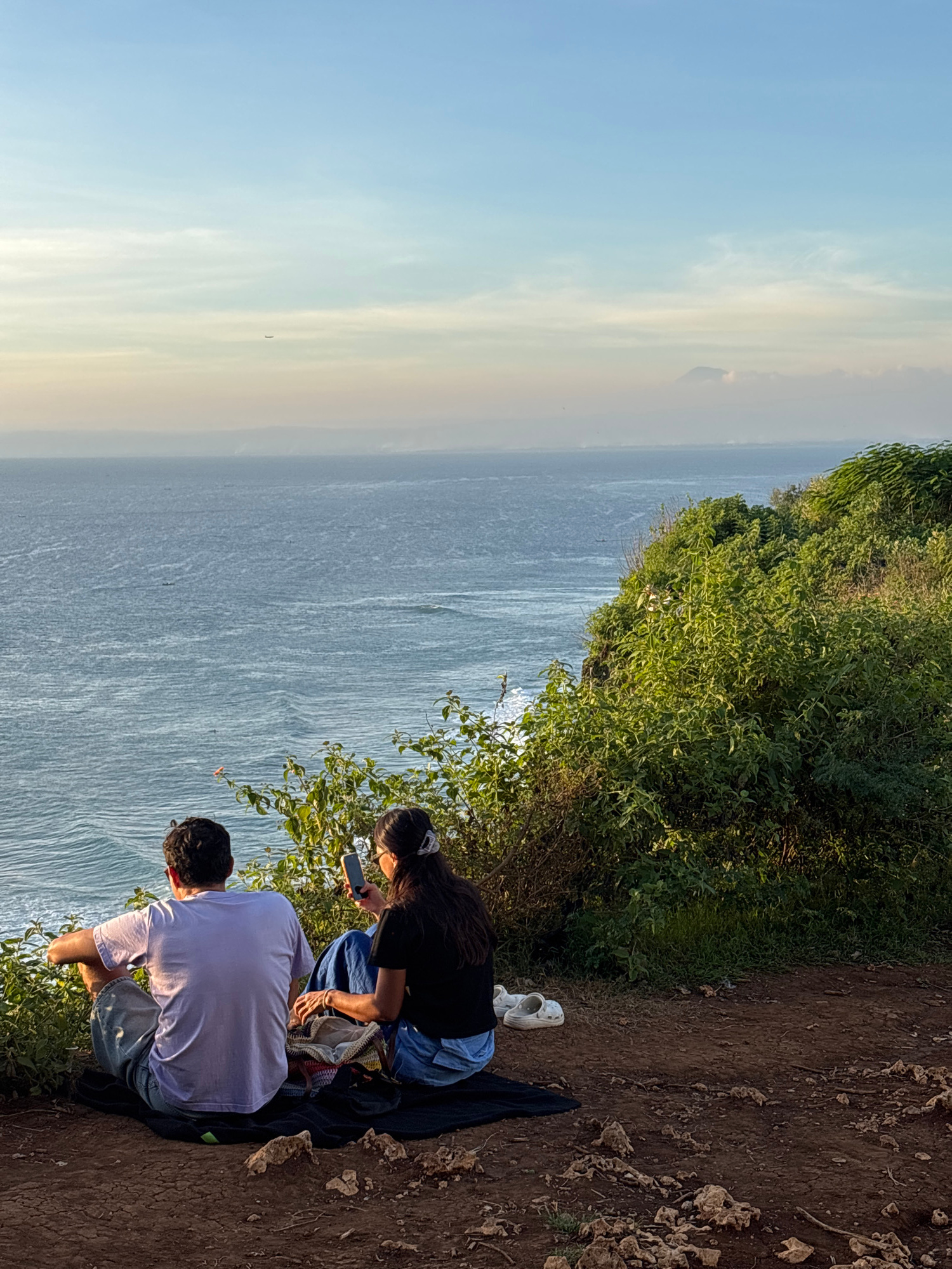 Two people are seated on the edge of a cliff overlooking a large body of water, possibly the ocean. A woman is wearing a black shirt and blue jeans, looking at her cell phone. A man in a white shirt a…read more