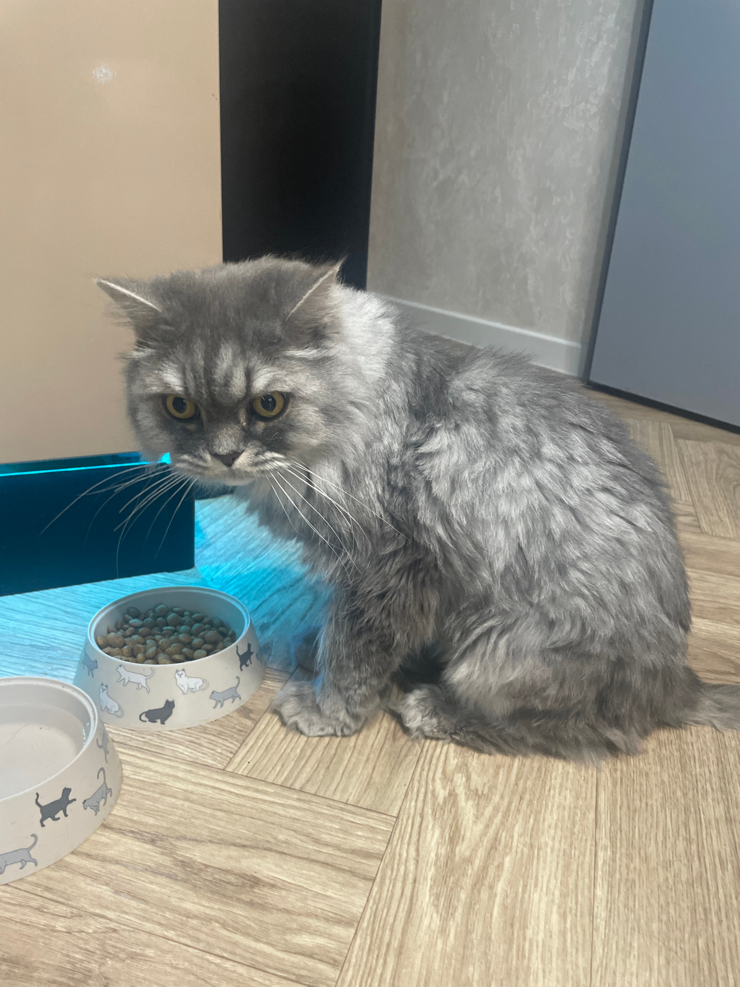 A gray, fluffy cat with yellow eyes is near two pet food bowls on a light wood-patterned floor. One bowl is filled with kibble. The bowls are white with a pattern of gray cat silhouettes. A blue lightβ¦read more