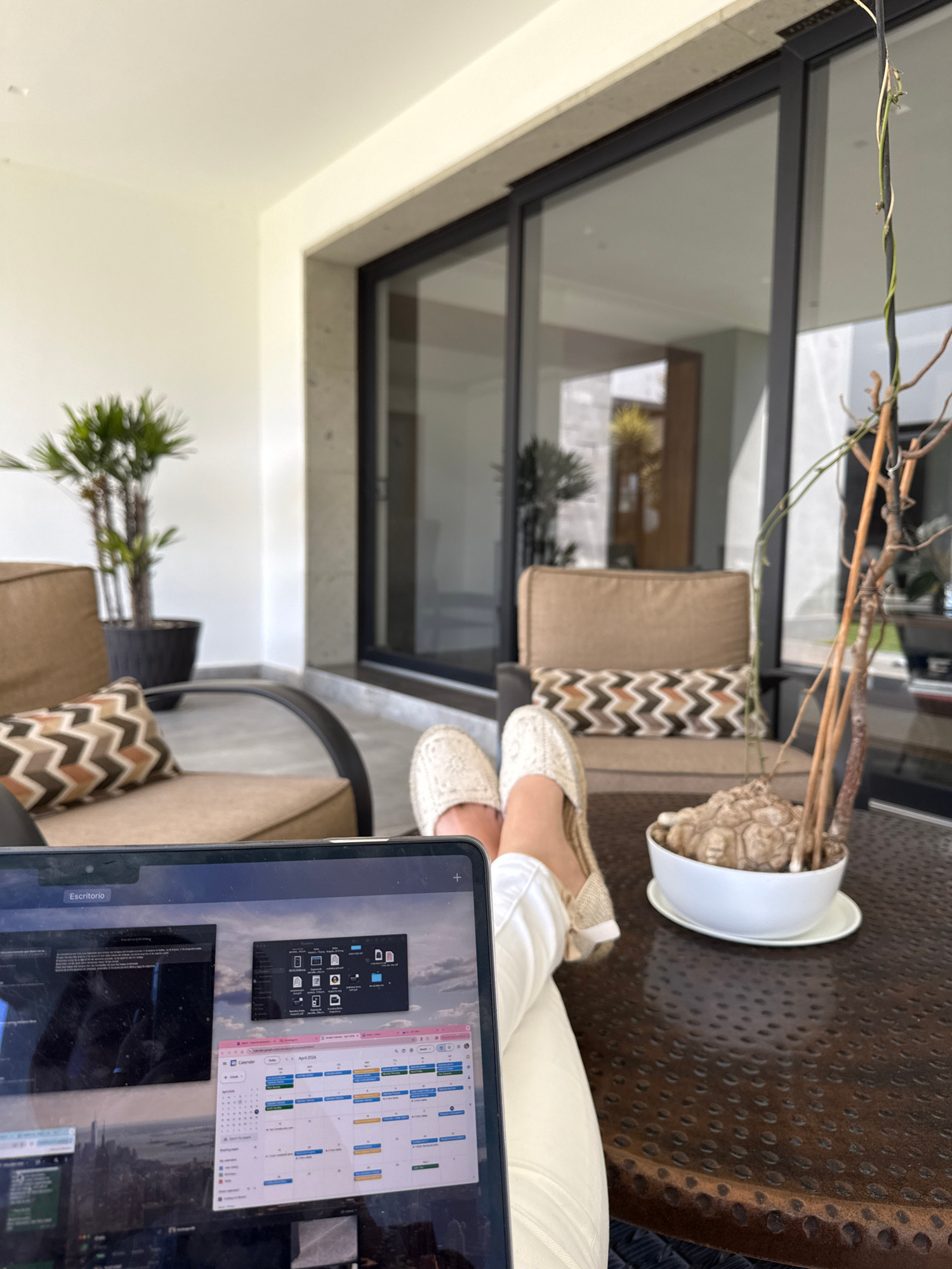 The scene depicts a person working on a laptop, with feet propped up, potentially on a balcony or patio. The laptop screen displays what appears to be a file manager and a calendar application. The enβ¦read more