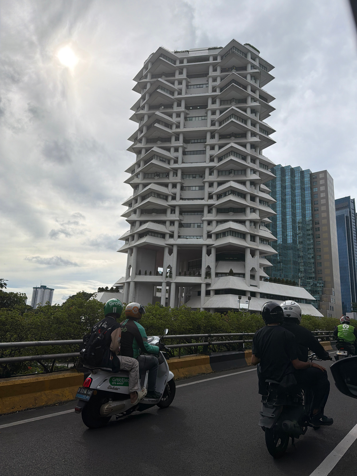 The image depicts a street scene in South Jakarta, Indonesia, with a distinctive architectural building in the background. The building is characterized by its layered, angular design, resembling a se…read more