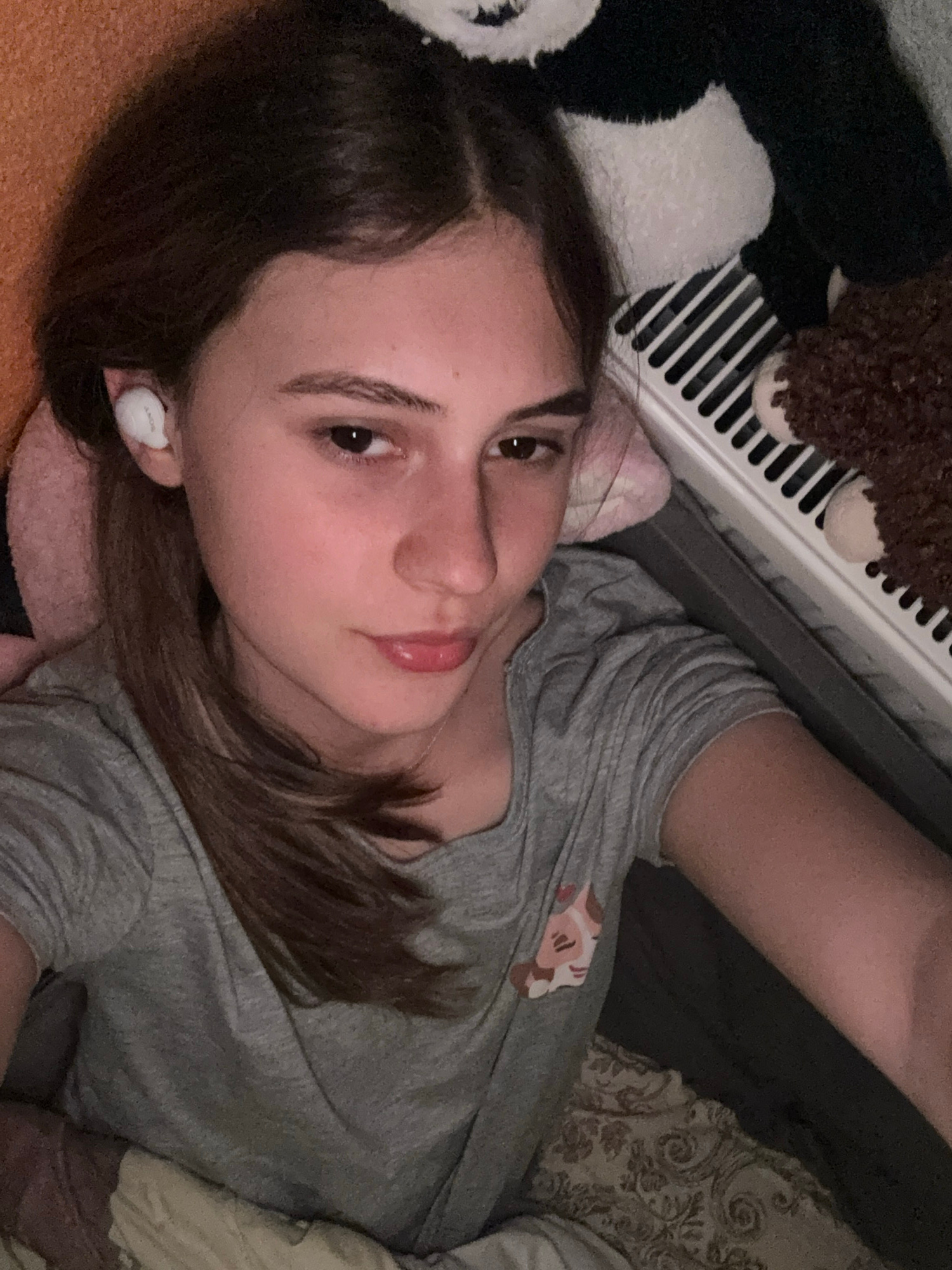 A young woman is captured in a close-up, upward-angle selfie, lying down in an indoor setting in Panagyurishte, Bulgaria. She has medium brown hair, dark eyes, and light skin, looking directly at the…read more
