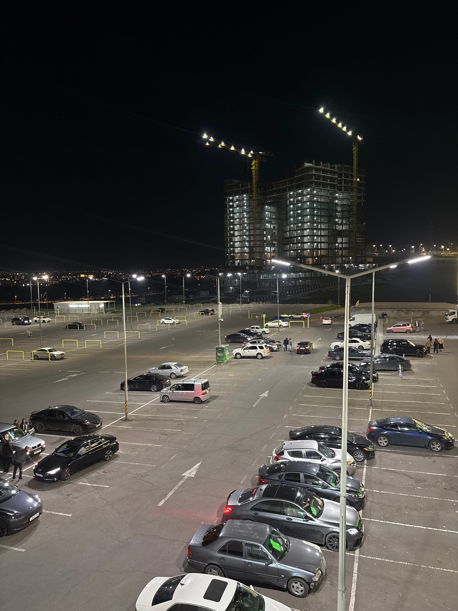 The image depicts a nighttime scene in Yerevan, Armenia. A multi-story building under construction with visible cranes is illuminated to the left. Adjacent to it is a large, well-lit parking lot with…read more