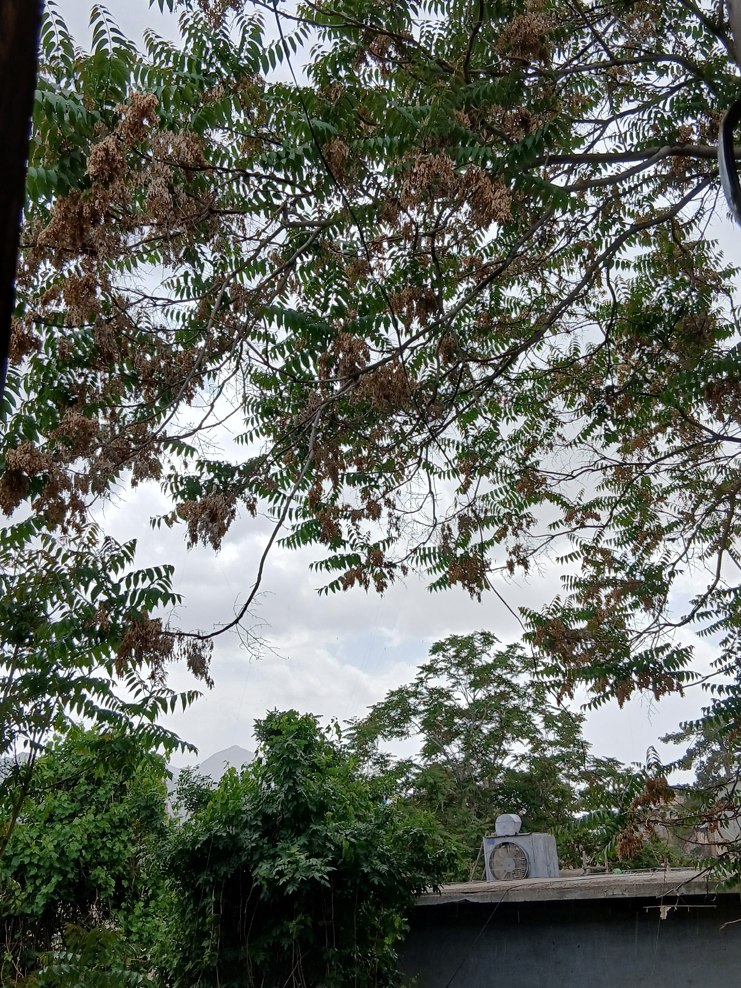 The image presents an upward perspective through the dense canopy of a tree, capturing a mix of natural elements and human infrastructure, likely within Quetta City Tehsil, Pakistan. The foreground i…read more