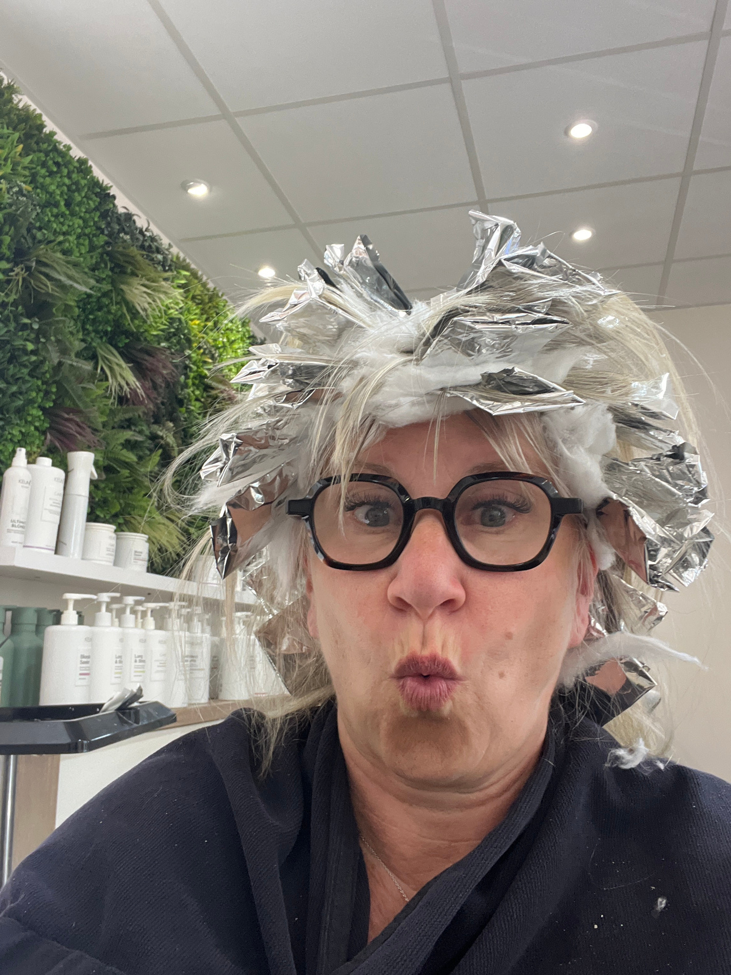 A selfie taken inside a hair salon in Montrond-les-Bains, France shows a woman with foil and cotton in her hair as part of a hair coloring process. She is wearing black-rimmed glasses and has her lips…read more