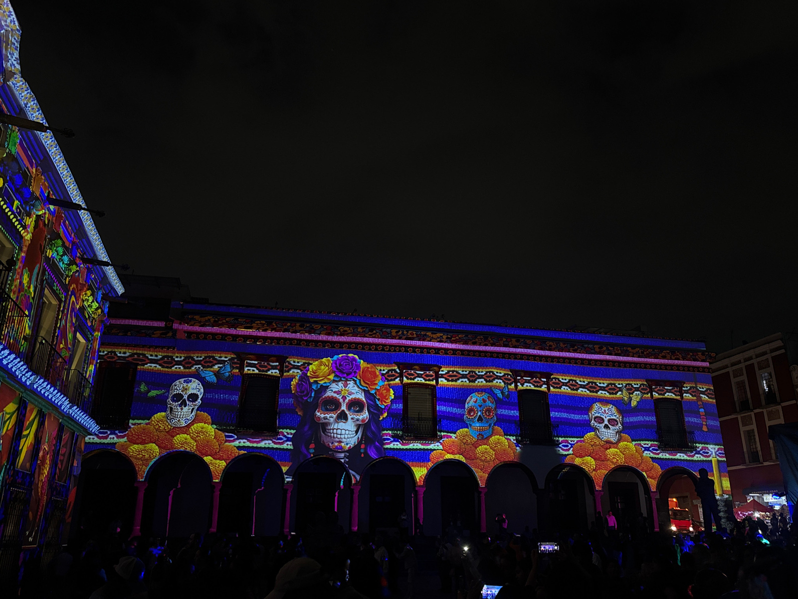 This image captures a night-time scene in the city of Puebla, Mexico, where a large crowd of people has gathered in a plaza to observe a building illuminated with projections of Day of the Dead imager…read more