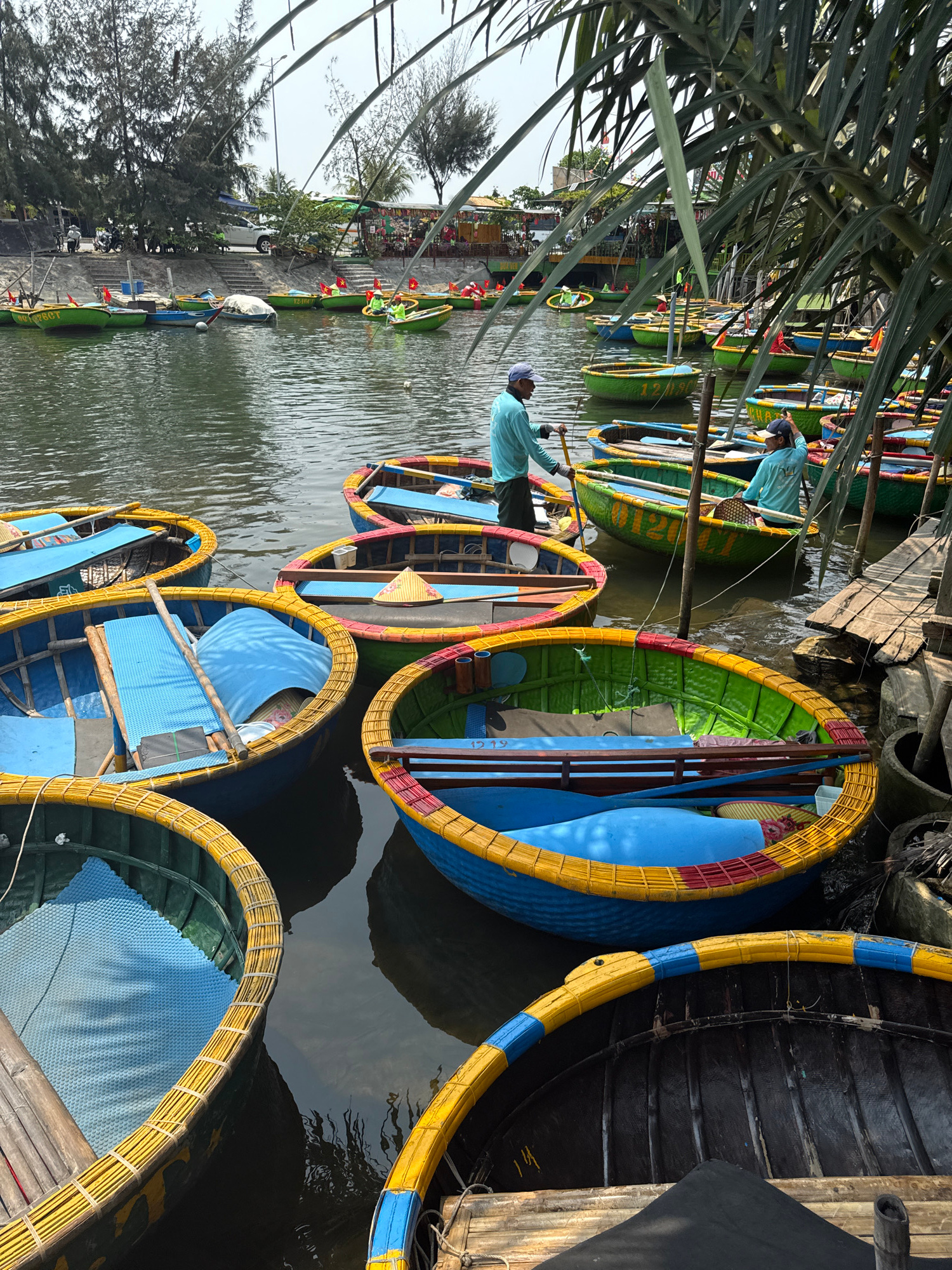 This image captures a lively scene of traditional Vietnamese basket boats, known as "thuyền thúng," on a waterway in Đà Nẵng, Vietnam, under bright daylight. Numerous round, colorful boats are present…read more