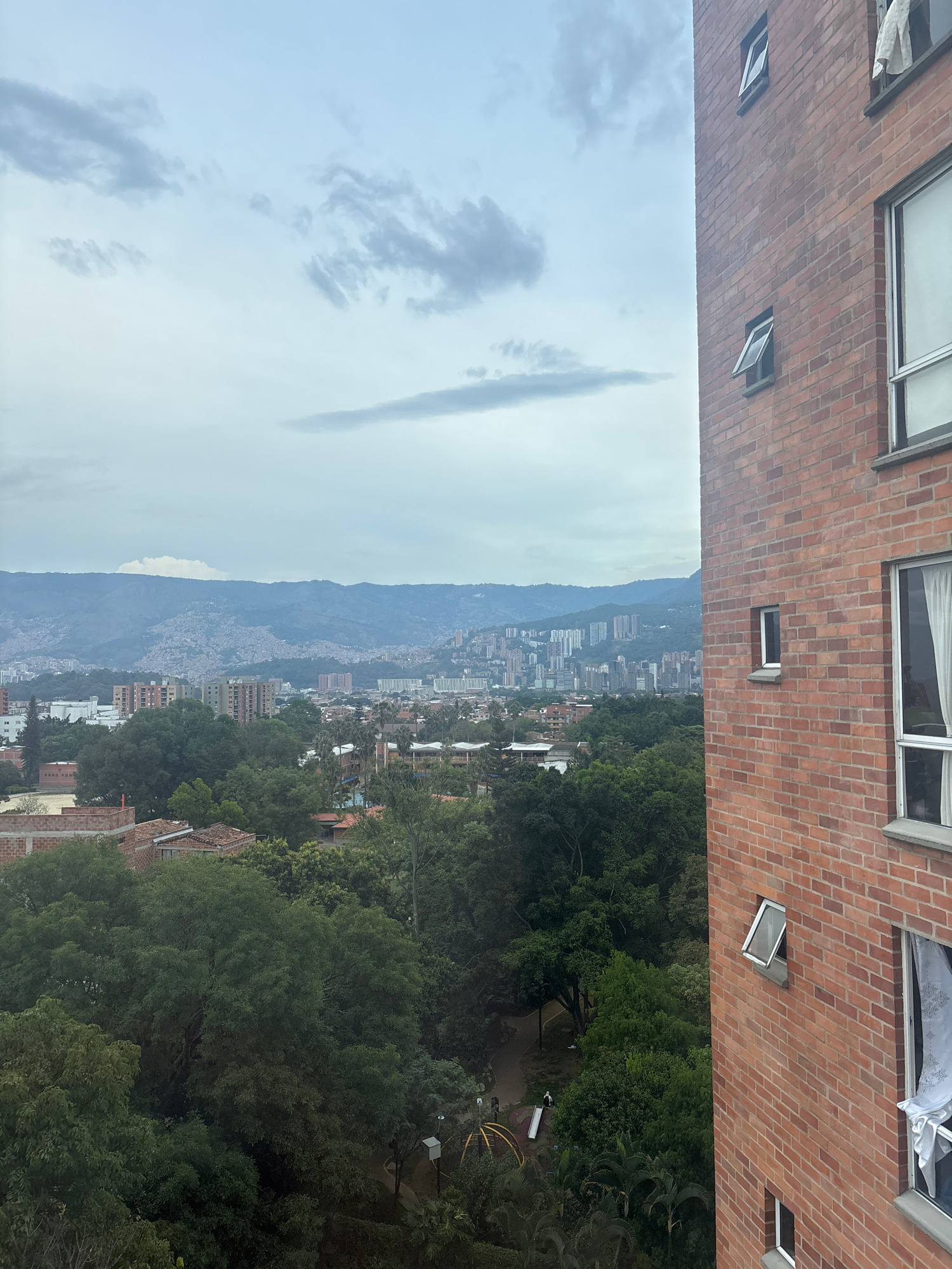 The image captures an elevated view of Medellín, Colombia, from an apartment window. A red brick building with visible windows frames the top of the shot. Below, a lush canopy of green trees fills the…read more